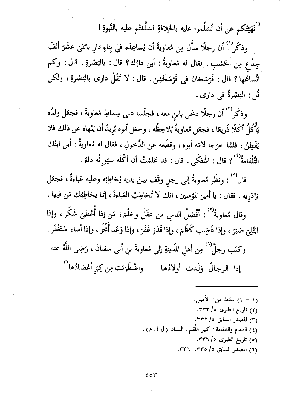 وَذَكَرَ أَنَّ رَجُلًا سَأَلَ مِنْ مُعَاوِيَةَ أَنْ يُسَاعِدَهُ فِي بْناءِ دَارٍ بِاثْنَيْ عَشَرَ أَلْفَ جِذْعٍ مِنَ الْخَشَبِ. فَقَالَ لَهُ مُعَاوِيَةُ: أَيْنَ دَارُكَ؟ قَالَ: بِالْبَصْرَةِ. وَكَمِ اتِّسَاعُهَا؟ قَالَ: فَرْسَخَانِ فِي فَرْسَخَيْنِ. قَالَ: لَا تَقُلْ دَارِي بِالْبَصْرَةِ، وَلَكِنْ قُلِ الْبَصْرَةُ فِي دَارِي.