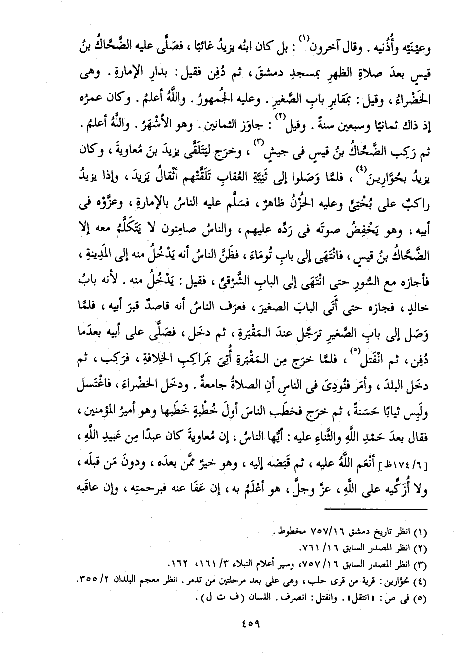 وَعَيْنَيْهِ وَأُذُنَيْهِ. وَقَالَ آخَرُونَ: بَلْ كَانَ ابْنُهُ يَزِيدُ غَائِبًا، فَصَلَّى عَلَيْهِ الضَّحَّاكُ بْنُ قَيْسٍ بَعْدَ صَلَاةِ الظُّهْرِ بِمَسْجِدِ دِمَشْقَ، ثُمَّ دُفِنَ فَقِيلَ: بِدَارِ الْإِمَارَةِ. وَهِيَ الْخَضْرَاءُ، وَقِيلَ: بِمَقَابِرِ بَابِ الصَّغِيرِ. وَعَلَيْهِ الْجُمْهُورُ. وَاللَّهُ أَعْلَمُ. وَكَانَ عُمْرُهُ إِذْ ذَاكَ ثَمَانِيًا وَسَبْعِينَ سَنَةً. وَقِيلَ: جَاوَزَ الثَّمَانِينَ. وَهُوَ الْأَشْهَرُ. وَاللَّهُ أَعْلَمُ. ثُمَّ رَكِبَ الضَّحَّاكُ بْنُ قَيْسٍ فِي جَيْشٍ، وَخَرَجَ لِيَتَلَقَّى يَزِيدَ بْنَ مُعَاوِيَةَ، وَكَانَ يَزِيدُ بِحُوَّارِينَ، فَلَمَّا وَصَلُوا إِلَى ثَنِيَّةِ الْعُقَابِ تَلَقَّتْهُمْ أَثْقَالُ يَزِيدَ، وَإِذَا يَزِيدُ رَاكِبٌ عَلَى بُخْتِيٍّ وَعَلَيْهِ الْحُزْنُ ظَاهِرٌ، فَسَلَّمَ عَلَيْهِ النَّاسُ بِالْإِمَارَةِ، وَعَزَّوْهُ فِي أَبِيهِ، وَهُوَ يَخْفِضُ صَوْتَهُ فِي رَدِّهِ عَلَيْهِمْ، وَالنَّاسُ صَامِتُونَ لَا يَتَكَلَّمُ مَعَهُ إِلَّا الضَّحَّاكُ بْنُ قَيْسٍ، فَانْتَهَى إِلَى بَابِ تُومَاءَ، فَظَنَّ النَّاسُ أَنَّهُ يَدْخُلُ مِنْهُ إِلَى الْمَدِينَةِ، فَأَجَازَهُ مَعَ السُّورِ حَتَّى انْتَهَى إِلَى الْبَابِ الشَّرْقِيِّ، فَقِيلَ: يَدْخُلُ مِنْهُ. لِأَنَّهُ بَابُ خَالِدٍ، فَجَازَهُ حَتَّى أَتَى الْبَابَ الصَّغِيرَ، فَعَرَفَ النَّاسُ أَنَّهُ قَاصِدٌ قَبْرَ أَبِيهِ، فَلَمَّا وَصَلَ إِلَى بَابِ الصَّغِيرِ تَرَجَّلَ عِنْدَ الْمَقْبَرَةِ، ثُمَّ دَخَلَ، فَصَلَّى عَلَى أَبِيهِ بَعْدَ مَا دُفِنَ، ثُمَّ انْفَتَلَ، فَلَمَّا خَرَجَ مِنَ الْمَقْبَرَةِ أَتَى بِمَرَاكِبِ الْخِلَافَةِ، فَرَكِبَ، ثُمَّ دَخَلَ الْبَلَدَ، وَأَمَرَ فَنُودِيَ فِي النَّاسِ أَنِ الصَّلَاةُ جَامِعَةٌ. وَدَخَلَ الْخَضْرَاءَ، فَاغْتَسَلَ وَلَبِسَ ثِيَابًا حَسَنَةً، ثُمَّ خَرَجَ فَخَطَبَ النَّاسَ أَوَّلَ خُطْبَةٍ خَطَبَهَا وَهُوَ أَمِيرُ الْمُؤْمِنِينَ، فَقَالَ بَعْدَ حَمْدِ اللَّهِ وَالثَنَاءِ عَلَيْهِ: أَيُّهَا النَّاسُ، إِنَّ مُعَاوِيَةَ كَانَ عَبْدًا مِنْ عَبِيدِ اللَّهِ، أَنْعَمَ اللَّهُ عَلَيْهِ، ثُمَّ قَبَضَهُ إِلَيْهِ، وَهُوَ خَيْرٌ مِمَّنْ بَعْدَهُ، وَدُونَ مَنْ قَبْلَهُ، وَلَا أُزَكِّيهِ عَلَى اللَّهِ، عَزَّ وَجَلَّ، هُوَ أَعْلَمُ بِهِ، إِنْ عَفَا عَنْهُ فَبِرَحْمَتِهِ، وَإِنْ عَاقَبَهُ