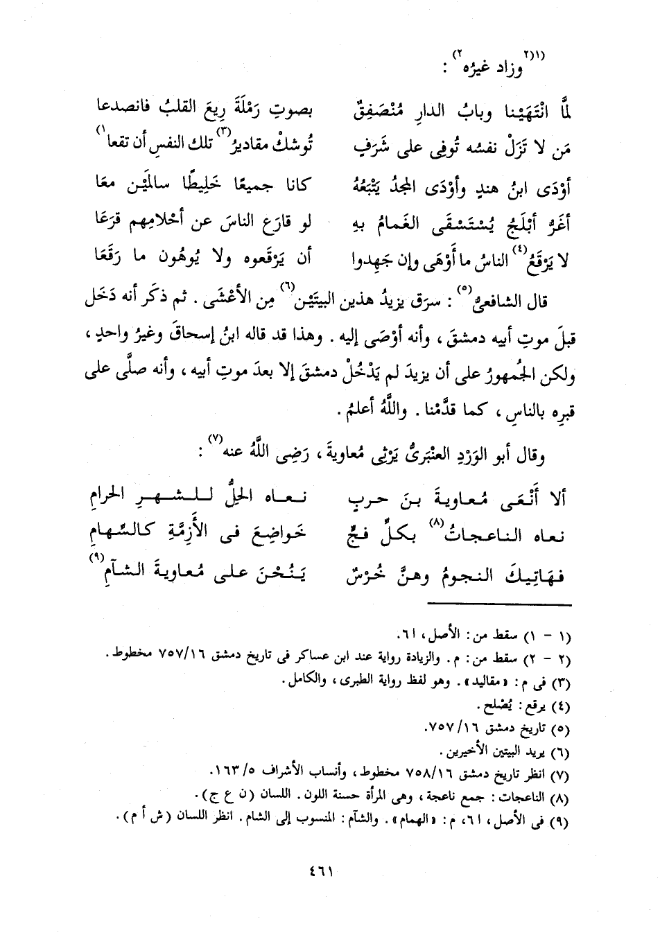 فَهَاتِيكَ النُّجُومُ وَهُنَّ خُرْسٌ ... يَنُحْنَ عَلَى مُعَاوِيَةَ الشَّآمِ