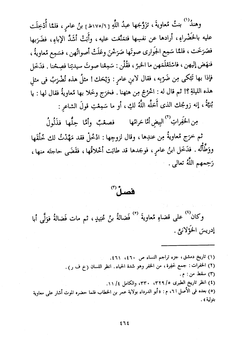 وَهِنْدُ بِنْتُ مُعَاوِيَةَ، تَزَوَّجَهَا عَبْدُ اللَّهِ بْنُ عَامِرٍ، فَلَمَّا أُدْخِلَتْ عَلَيْهِ بِالْخَضْرَاءِ، أَرَادَهَا عَنْ نَفْسِهَا فَتَمَنَّعَتْ عَلَيْهِ، وَأَبَتْ أَشَدَّ الْإِبَاءِ، فَضَرَبَهَا فَصَرَخَتْ، فَلَمَّا سَمِعَ الْجَوَارِيَ صَوْتَهَا صَرَخْنَ وَعَلَتْ أَصْوَاتُهُنَّ، فَسَمِعَ مُعَاوِيَةُ، فَنَهَضَ إِلَيْهِنَّ، فَاسْتَعْلَمَهُنَّ مَا الْخَبَرُ، فَقُلْنَ: سَمِعْنَا صَوْتَ سَيِّدَتِنَا فَصِحْنَا. فَدَخَلَ فَإِذَا بِهَا تَبْكِي مِنْ ضَرْبِهِ، فَقَالَ لِابْنِ عَامِرٍ: وَيْحَكَ! مِثْلُ هَذِهِ تُضْرَبُ فِي مِثْلِ هَذِهِ اللَّيْلَةِ؟ ! ثُمَّ قَالَ لَهُ: اخْرُجْ مِنْ هَاهُنَا. فَخَرَجَ وَخَلَا بِهَا مُعَاوِيَةُ فَقَالَ لَهَا: يَا بُنَيَّةُ، إِنَّهُ زَوْجُكِ الَّذِي أَحَلَّهُ اللَّهُ لَكِ، أَوَ مَا سَمِعْتِ قَوْلَ الشَّاعِرِ: