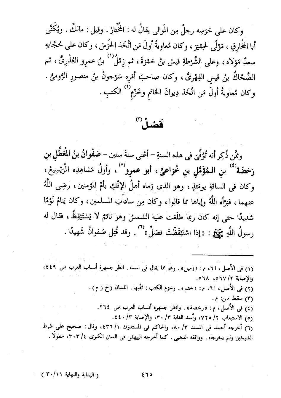 وَمِمَّنْ ذُكِرَ أَنَّهُ تُوُفِّيَ فِي هَذِهِ السَّنَةِ - أَعْنِي سَنَةَ سِتِّينَ - صَفْوَانُ بْنُ الْمُعَطَّلِ بْنِ رَحَضَةَ بْنِ الْمُؤَمَّلِ بْنِ خُزَاعِيٍّ، أَبُو عَمْرٍو، وَأَوَّلُ مَشَاهِدِهِ الْمُرَيْسِيعُ، وَكَانَ فِي السَّاقَةِ يَوْمَئِذٍ، وَهُوَ الَّذِي رَمَاهُ أَهْلُ الْإِفْكِ بِأُمِّ الْمُؤْمِنِينَ، رَضِيَ اللَّهُ عَنْهُمَا، فَبَرَّأَهُ اللَّهُ وَإِيَّاهَا مِمَّا قَالُوا، وَكَانَ مِنْ سَادَاتِ الْمُسْلِمِينَ، وَكَانَ يَنَامُ نَوْمًا شَدِيدًا حَتَّى إِنَّهُ كَانَ رُبَّمَا طَلَعَتْ عَلَيْهِ الشَّمْسُ وَهُوَ نَائِمٌ لَا يَسْتَيْقِظُ، فَقَالَ لَهُ رَسُولُ اللَّهِ صَلَّى اللَّهُ عَلَيْهِ وَسَلَّمَ: " «إِذَا اسْتَيْقَظْتَ فَصَلِّ» ". وَقَدْ قُتِلَ صَفْوَانُ شَهِيدًا.