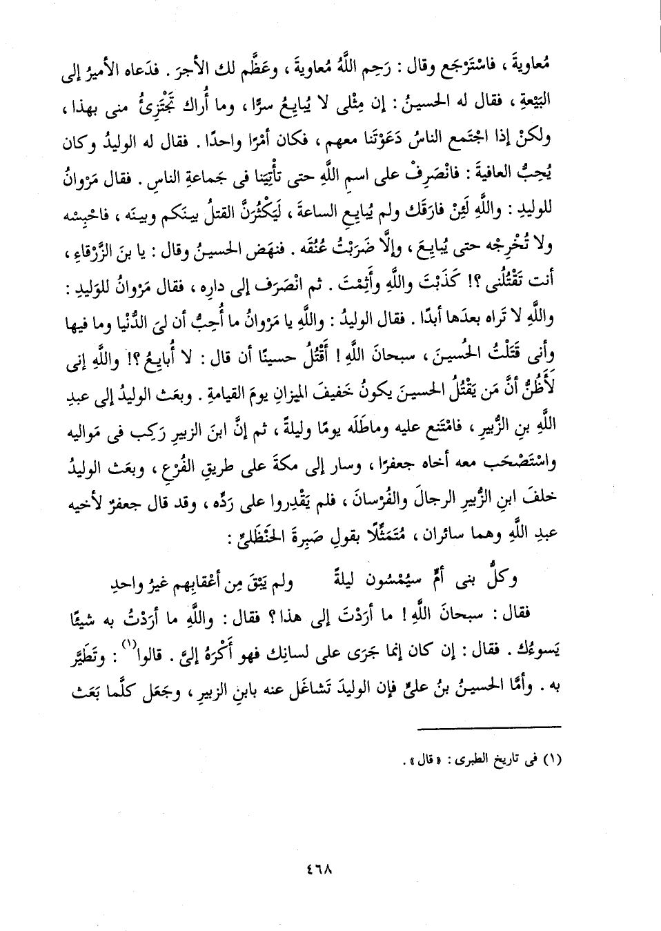 مُعَاوِيَةَ، فَاسْتَرْجَعَ وَقَالَ: رَحِمَ اللَّهُ مُعَاوِيَةَ، وَعَظَّمَ لَكَ الْأَجْرَ. فَدَعَاهُ الْأَمِيرُ إِلَى الْبَيْعَةِ، فَقَالَ لَهُ الْحُسَيْنُ: إِنَّ مِثْلِي لَا يُبَايِعُ سِرًّا، وَمَا أَرَاكَ تَجْتَزِئُ مِنِّي بِهَذَا، وَلَكِنْ إِذَا اجْتَمَعَ النَّاسُ دَعَوْتَنَا مَعَهُمْ، فَكَانَ أَمْرًا وَاحِدًا. فَقَالَ لَهُ الْوَلِيدُ وَكَانَ يُحِبُّ الْعَافِيَةَ: فَانْصَرِفْ عَلَى اسْمِ اللَّهِ حَتَّى تَأْتِيَنَا فِي جَمَاعَةِ النَّاسِ. فَقَالَ مَرْوَانُ لِلْوَلِيدِ: وَاللَّهِ لَئِنْ فَارَقَكَ وَلَمْ يُبَايِعِ السَّاعَةَ، لَيَكْثُرَنَّ الْقَتْلُ بَيْنَكُمْ وَبَيْنَهُ، فَاحْبِسْهُ وَلَا تُخْرِجْهُ حَتَّى يُبَايِعَ، وَإِلَّا ضَرَبْتُ عُنُقَهُ. فَنَهَضَ الْحُسَيْنُ وَقَالَ: يَابْنَ الزَّرْقَاءِ، أَنْتَ تَقْتُلُنِي؟ ! كَذَبْتَ وَاللَّهِ وَأَثِمْتَ. ثُمَّ انْصَرَفَ إِلَى دَارِهِ، فَقَالَ مَرْوَانُ لِلْوَلِيدِ: وَاللَّهِ لَا تَرَاهُ بَعْدَهَا أَبَدًا. فَقَالَ الْوَلِيدُ: وَاللَّهِ يَا مَرْوَانُ مَا أُحِبُّ أَنَّ لِي الدُّنْيَا وَمَا فِيهَا وَأَنِّي قَتَلْتُ الْحُسَيْنَ، سُبْحَانَ اللَّهِ! أَقْتُلُ حُسَيْنًا أَنْ قَالَ: لَا أُبَايِعُ؟ ! وَاللَّهِ إِنِّي لَأَظُنُّ أَنَّ مَنْ يَقْتُلُ الْحُسَيْنَ يَكُونُ خَفِيفَ الْمِيزَانِ يَوْمَ الْقِيَامَةِ. وَبَعَثَ الْوَلِيدُ إِلَى عَبْدِ اللَّهِ بْنِ الزُّبَيْرِ فَامْتَنَعَ عَلَيْهِ وَمَاطَلَهُ يَوْمًا وَلَيْلَةً، ثُمَّ إِنَّ ابْنَ الزُّبَيْرِ رَكِبَ فِي مَوَالِيهِ وَاسْتَصْحَبَ مَعَهُ أَخَاهُ جَعْفَرًا، وَسَارَ إِلَى مَكَّةَ عَلَى طَرِيقِ الْفُرْعِ، وَبَعَثَ الْوَلِيدُ خَلْفَ ابْنِ الزُّبَيْرِ الرِّجَالَ وَالْفُرْسَانَ، فَلَمْ يَقْدِرُوا عَلَى رَدِّهِ، وَقَدْ قَالَ جَعْفَرٌ لِأَخِيهِ عَبْدِ اللَّهِ وَهُمَا سَائِرَانِ، مُتَمَثِّلًا بِقَوْلِ صَبِرَةَ الْحَنْظَلِيِّ: