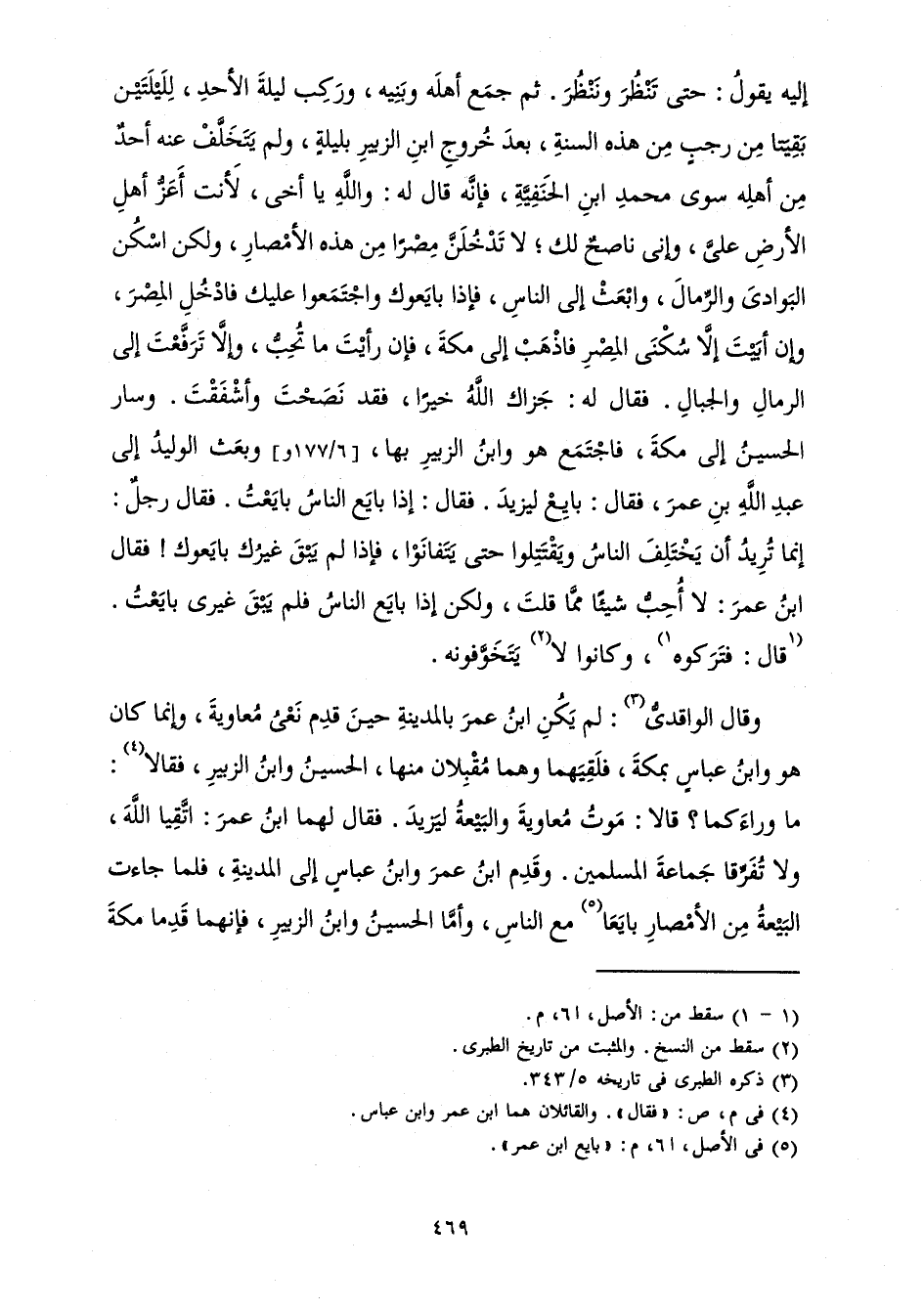 إِلَيْهِ يَقُولُ: حَتَّى تَنْظُرَ وَنَنْظُرَ. ثُمَّ جَمَعَ أَهْلَهُ وَبَنِيهِ، وَرَكِبَ لَيْلَةَ الْأَحَدِ، لِلَيْلَتَيْنِ بَقِيَتَا مِنْ رَجَبٍ مِنْ هَذِهِ السَّنَةِ، بَعْدَ خُرُوجِ ابْنِ الزُّبَيْرِ بِلَيْلَةٍ، وَلَمْ يَتَخَلَّفْ عَنْهُ أَحَدٌ مِنْ أَهْلِهِ سِوَى مُحَمَّدِ ابْنِ الْحَنَفِيَّةِ فَإِنَّهُ قَالَ لَهُ: وَاللَّهِ يَا أَخِي، لَأَنْتَ أَعَزُّ أَهْلِ الْأَرْضِ عَلِيَّ، وَإِنِّي نَاصِحٌ لَكَ ; لَا تَدْخُلَنَّ مِصْرًا مِنْ هَذِهِ الْأَمْصَارِ، وَلَكِنِ اسْكُنِ الْبَوَادِيَ وَالرِّمَالَ، وَابْعَثْ إِلَى النَّاسِ، فَإِذَا بَايَعُوكَ وَاجْتَمَعُوا عَلَيْكَ فَادْخُلِ الْمِصْرَ، وَإِنْ أَبَيْتَ إِلَّا سُكْنَى الْمِصْرِ فَاذْهَبْ إِلَى مَكَّةَ، فَإِنْ رَأَيْتَ مَا تُحِبُّ، وَإِلَّا تَرَفَّعْتَ إِلَى الرِّمَالِ وَالْجِبَالِ. فَقَالَ لَهُ: جَزَاكَ اللَّهُ خَيْرًا، فَقَدْ نَصَحْتَ وَأَشْفَقْتَ. وَسَارَ الْحُسَيْنُ إِلَى مَكَّةَ، فَاجْتَمَعَ هُوَ وَابْنُ الزُّبَيْرِ بِهَا، وَبَعَثَ الْوَلِيدُ إِلَى عَبْدِ اللَّهِ بْنِ عُمَرَ فَقَالَ: بَايِعْ لِيَزِيدَ. فَقَالَ: إِذَا بَايَعَ النَّاسُ بَايَعْتُ. فَقَالَ رَجُلٌ: إِنَّمَا تُرِيدُ أَنْ يَخْتَلِفَ النَّاسُ وَيَقْتَتِلُوا حَتَّى يَتَفَانَوْا، فَإِذَا لَمْ يَبْقَ غَيْرُكَ بَايَعُوكَ! فَقَالَ ابْنُ عُمَرَ: لَا أُحِبُّ شَيْئًا مِمَّا قُلْتَ، وَلَكِنْ إِذَا بَايَعَ النَّاسُ فَلَمْ يَبْقَ غَيْرِي بَايَعْتُ. قَالَ: فَتَرَكُوهُ، وَكَانُوا لَا يَتَخَوَّفُونَهُ.