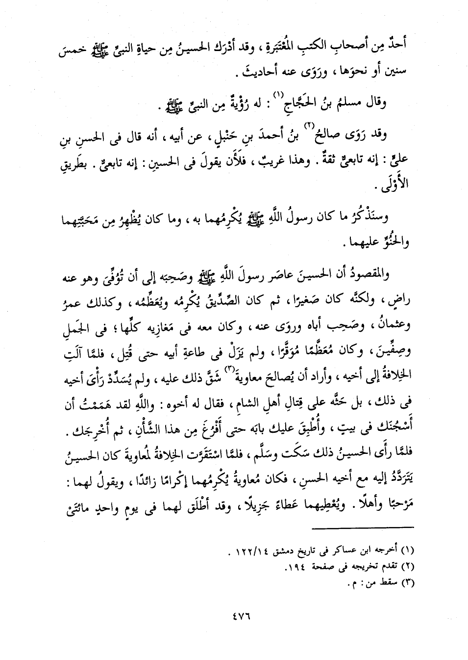 وَقَدْ رَوَى صَالِحُ بْنُ أَحْمَدَ بْنِ حَنْبَلٍ، عَنْ أَبِيهِ، أَنَّهُ قَالَ فِي الْحَسَنِ بْنِ عَلِيٍّ: إِنَّهُ تَابِعِيٌّ ثِقَةٌ. وَهَذَا غَرِيبٌ، فَلَأَنْ يَقُولَ فِي الْحُسَيْنِ: إِنَّهُ تَابِعِيٌّ بِطَرِيقِ الْأَوْلَى.