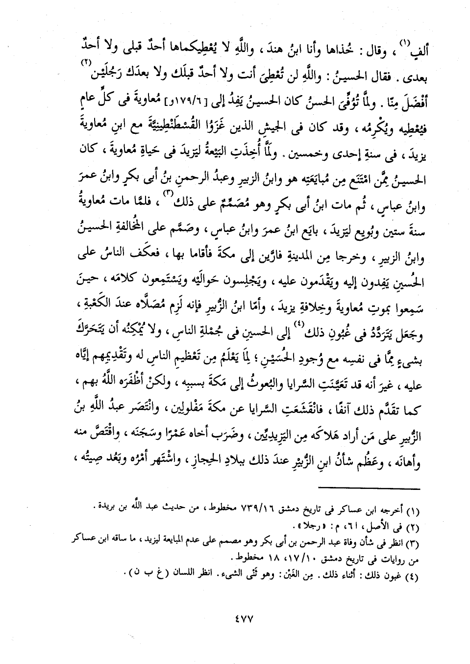 أَلْفٍ، وَقَالَ: خُذَاهَا وَأَنَا ابْنُ هِنْدَ، وَاللَّهِ لَا يُعْطِيكُمَاهَا أَحَدٌ قَبْلِي وَلَا أَحَدٌ بَعْدِي. فَقَالَ الْحُسَيْنُ: وَاللَّهِ لَنْ تُعْطِيَ أَنْتَ وَلَا أَحَدٌ قَبْلَكَ وَلَا بَعْدَكَ رَجُلَيْنِ أَفْضَلَ مِنَّا. وَلِمَا تُوُفِّيَ الْحَسَنُ كَانَ الْحُسَيْنُ يَفِدُ إِلَى مُعَاوِيَةَ فِي كُلِّ عَامٍ فَيُعْطِيهِ وَيُكْرِمُهُ، وَقَدْ كَانَ فِي الْجَيْشِ الَّذِينَ غَزَوُا الْقُسْطَنْطِينِيَّةَ مَعَ ابْنِ مُعَاوِيَةَ يَزِيدَ، فِي سَنَةِ إِحْدَى وَخَمْسِينَ. وَلَمَّا أَخُذَتِ الْبَيْعَةُ لِيَزِيدَ فِي حَيَاةِ مُعَاوِيَةَ، كَانَ الْحُسَيْنُ مِمَّنِ امْتَنَعَ مِنْ مُبَايَعَتِهِ هُوَ وَابْنُ الزُّبَيْرِ وَعَبْدُ الرَّحْمَنِ بْنُ أَبِي بَكْرٍ وَابْنُ عُمَرَ وَابْنُ عَبَّاسٍ، ثُمَّ مَاتَ ابْنُ أَبِي بَكْرٍ وَهُوَ مُصَمِّمٌ عَلَى ذَلِكَ، فَلَمَّا مَاتَ مُعَاوِيَةُ سَنَةَ سِتِّينَ وَبُويِعَ لِيَزِيدَ، بَايَعَ ابْنُ عُمَرَ وَابْنُ عَبَّاسٍ، وَصَمَّمَ عَلَى الْمُخَالَفَةِ الْحُسَيْنُ وَابْنُ الزُّبَيْرِ، وَخَرَجَا مِنَ الْمَدِينَةِ فَارِّينَ إِلَى مَكَّةَ فَأَقَامَا بِهَا، فَعَكَفَ النَّاسُ عَلَى الْحُسَيْنِ يَفِدُونَ إِلَيْهِ وَيَقْدَمُونَ عَلَيْهِ، وَيَجْلِسُونَ حَوَالَيْهِ وَيَسْتَمِعُونَ كَلَامَهُ، حِينَ سَمِعُوا بِمَوْتِ مُعَاوِيَةَ وَخِلَافَةِ يَزِيدَ، وَأَمَّا ابْنُ الزُّبَيْرِ فَإِنَّهُ لَزِمَ مُصَلَّاهُ عِنْدَ الْكَعْبَةِ، وَجَعَلَ يَتَرَدَّدُ فِي غُبُونِ ذَلِكَ إِلَى الْحُسَيْنِ فِي جُمْلَةِ النَّاسِ، وَلَا يُمْكِنُهُ أَنْ يَتَحَرَّكَ بِشَيْءٍ مِمَّا فِي نَفْسِهِ مَعَ وُجُودِ الْحُسَيْنِ ; لِمَا يَعْلَمُ مِنْ تَعْظِيمِ النَّاسِ لَهُ وَتَقْدِيمِهِمْ إِيَّاهُ عَلَيْهِ، غَيْرَ أَنَّهُ قَدْ تَعَيَّنَتِ السَّرَايَا وَالْبُعُوثِ إِلَى مَكَّةَ بِسَبَبِهِ، وَلَكِنْ أَظْفَرَهُ اللَّهُ بِهِمْ، كَمَا تَقَدَّمَ ذَلِكَ آنِفًا، فَانْقَشَعَتِ السَّرَايَا عَنْ مَكَّةَ مَفْلُولِينَ، وَانْتَصَرَ عَبْدُ اللَّهِ بْنُ الزُّبَيْرِ عَلَى مَنْ أَرَادَ هَلَاكَهُ مِنَ الْيَزِيدِيِّينَ، وَضَرَبَ أَخَاهُ عَمْرًا وَسَجَنَهُ، وَاقْتَصَّ مِنْهُ وَأَهَانَهُ، وَعَظُمَ شَأْنُ ابْنِ الزُّبَيْرِ عِنْدَ ذَلِكَ بِبِلَادِ الْحِجَازِ، وَاشْتَهَرَ أَمْرُهُ وَبَعُدَ صِيتُهُ،