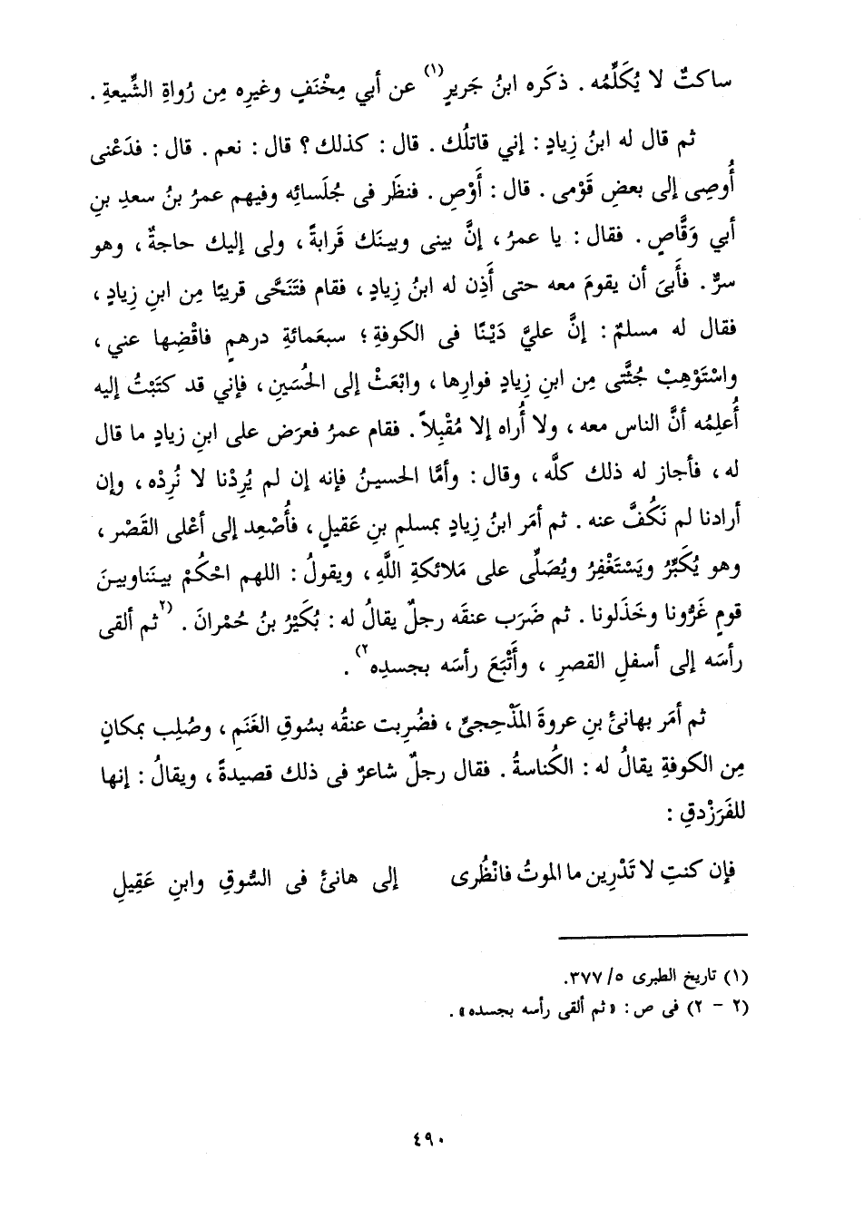 ثُمَّ قَالَ لَهُ ابْنُ زِيَادٍ: إِنِّي قَاتِلُكَ. قَالَ: كَذَلِكَ؟ قَالَ: نَعَمْ. قَالَ: فَدَعْنِي أُوصِي إِلَى بَعْضِ قَوْمِي. قَالَ: أَوْصِ. فَنَظَرَ فِي جُلَسَائِهِ وَفِيهِمْ عُمَرُ بْنُ سَعْدِ بْنِ أَبِي وَقَّاصٍ. فَقَالَ: يَا عُمَرُ، إِنَّ بَيْنِي وَبَيْنَكَ قَرَابَةٌ، وَلِي إِلَيْكَ حَاجَةٌ، وَهُوَ سِرٌّ. فَأَبَى أَنْ يَقُومَ مَعَهُ حَتَّى أَذِنَ لَهُ ابْنُ زِيَادٍ، فَقَامَ فَتَنَحَّى قَرِيبًا مِنِ ابْنِ زِيَادٍ، فَقَالَ لَهُ مُسْلِمٌ: إِنَّ عَلَيَّ دَيْنًا فِي الْكُوفَةِ ; سَبْعَمِائَةِ دِرْهَمٍ فَاقْضِهَا عَنِّي، وَاسْتَوْهِبْ جُثَّتِي مِنِ ابْنِ زِيَادٍ فَوَارِهَا، وَابْعَثْ إِلَى الْحُسَيْنِ، فَإِنِّي قَدْ كَتَبْتُ إِلَيْهِ أُعْلِمُهُ أَنَّ النَّاسَ مَعَهُ، وَلَا أَرَاهُ إِلَّا مُقْبِلًا. فَقَامَ عُمَرُ فَعَرَضَ عَلَى ابْنِ زِيَادٍ مَا قَالَ لَهُ، فَأَجَازَ لَهُ ذَلِكَ كُلَّهُ، وَقَالَ: وَأَمَّا الْحُسَيْنُ فَإِنَّهُ إِنْ لَمْ يُرِدْنَا لَا نُرِدْهُ، وَإِنْ أَرَادَنَا لَمْ نَكُفَّ عَنْهُ. ثُمَّ أَمَرَ ابْنُ زِيَادٍ بِمُسْلِمِ بْنِ عَقِيلٍ، فَأُصْعِدَ إِلَى أَعَلَى الْقَصْرِ، وَهُوَ يُكَبِّرُ وَيَسْتَغْفِرُ وَيُصَلِّي عَلَى مَلَائِكَةِ اللَّهِ، وَيَقُولُ: اللَّهُمَّ احْكُمْ بَيْنَنَا وَبَيْنَ قَوْمٍ غَرُّونَا وَخَذَلُونَا. ثُمَّ ضَرَبَ عُنُقَهُ رَجُلٌ يُقَالُ لَهُ: بُكَيْرُ بْنُ حُمْرَانَ. ثُمَّ أَلْقَى رَأْسَهُ إِلَى أَسْفَلِ الْقَصْرِ، وَأَتْبَعَ رَأْسَهُ بِجَسَدِهِ.