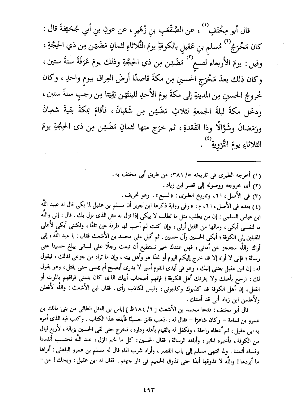 قَالَ أَبُو مِخْنَفٍ، عَنِ الصَّقْعَبِ بْنِ زُهَيْرٍ، عَنْ عَوْنِ بْنِ أَبِي جُحَيْفَةَ قَالَ: كَانَ مَخْرَجُ مُسْلِمِ بْنِ عَقِيلٍ بِالْكُوفَةِ يَوْمَ الثُّلَاثَاءَ لَثَمَانٍ مَضَيْنَ مِنْ ذِي الْحِجَّةِ، وَقِيلَ: يَوْمَ الْأَرْبِعَاءِ لِتِسْعٍ مَضَيْنَ مِنْ ذِي الْحِجَّةِ وَذَلِكَ يَوْمَ عَرَفَةَ سَنَةَ سِتِّينَ، وَكَانَ ذَلِكَ بَعْدَ مَخْرَجِ الْحُسَيْنِ مِنْ مَكَّةَ قَاصِدًا أَرْضَ الْعِرَاقِ بِيَوْمٍ وَاحِدٍ، وَكَانَ خُرُوجُ الْحُسَيْنِ مِنَ الْمَدِينَةِ إِلَى مَكَّةَ يَوْمَ الْأَحَدِ لِلَيْلَتَيْنِ بَقِيَتَا مِنْ رَجَبٍ سَنَةَ سِتِّينَ، وَدَخَلَ مَكَّةَ لَيْلَةَ الْجُمُعَةِ لِثَلَاثٍ مَضَيْنَ مِنْ شَعْبَانَ، فَأَقَامَ بِمَكَّةَ بَقِيَّةَ شَعْبَانَ وَرَمَضَانَ وَشَوَّالًا وَذَا الْقَعْدَةِ، ثُمَّ خَرَجَ مِنْهَا لِثَمَانٍ مَضَيْنَ مِنْ ذِي الْحِجَّةِ يَوْمَ الثُّلَاثَاءِ يَوْمَ التَّرْوِيَةِ.