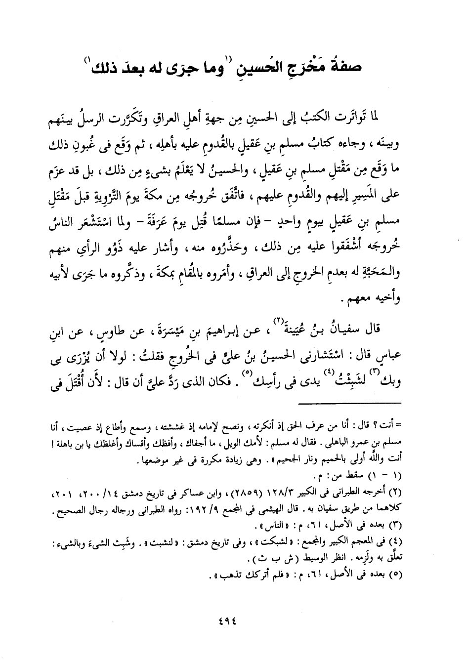 لَمَّا تَوَاتَرَتِ الْكُتُبُ إِلَى الْحُسَيْنِ مِنْ جِهَةِ أَهْلِ الْعِرَاقِ وَتَكَرَّرَتِ الرُّسُلُ بَيْنَهُمْ وَبَيْنَهُ، وَجَاءَهُ كِتَابُ مُسْلِمِ بْنِ عَقِيلٍ بِالْقُدُومِ عَلَيْهِ بِأَهْلِهِ، ثُمَّ وَقَعَ فِي غُبُونِ ذَلِكَ مَا وَقَعَ مِنْ مَقْتَلِ مُسْلِمِ بْنِ عَقِيلٍ وَالْحُسَيْنُ لَا يَعْلَمُ بِشَيْءٍ مِنْ ذَلِكَ، بَلْ قَدْ عَزَمَ عَلَى الْمَسِيرِ إِلَيْهِمْ وَالْقُدُومِ عَلَيْهِمْ، فَاتَّفَقَ خُرُوجُهُ مِنْ مَكَّةَ يَوْمَ التَّرْوِيَةِ قَبْلَ مَقْتَلِ مُسْلِمِ بْنِ عَقِيلٍ بِيَوْمٍ وَاحِدٍ - فَإِنَّ مُسْلِمًا قُتِلَ يَوْمَ عَرَفَةَ - وَلَمَّا اسْتَشْعَرَ النَّاسُ خُرُوجَهُ أَشْفَقُوا عَلَيْهِ مِنْ ذَلِكَ، وَحَذَّرُوهُ مِنْهُ، وَأَشَارَ عَلَيْهِ ذَوُو الرَّأْيِ مِنْهُمْ وَالْمَحَبَّةِ لَهُ بِعَدَمِ الْخُرُوجِ إِلَى الْعِرَاقِ، وَأَمَرُوهُ بِالْمُقَامِ بِمَكَّةَ، وَذَكَّرُوهُ مَا جَرَى لِأَبِيهِ وَأَخِيهِ مَعَهُمْ.