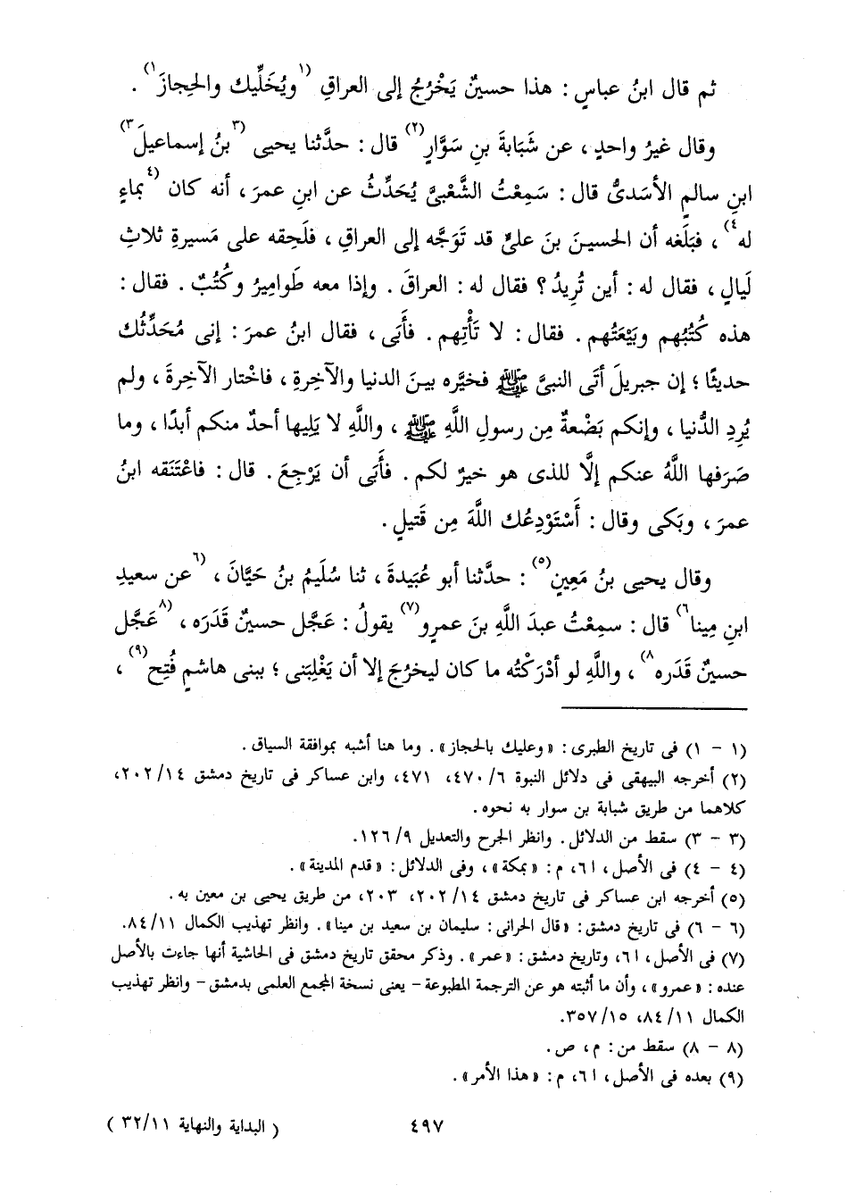 وَقَالَ يَحْيَى بْنُ مَعِينٍ: حَدَّثَنَا أَبُو عُبَيْدَةَ، ثَنَا سُلَيْمُ بْنُ حَيَّانَ، عَنْ سَعِيدِ بْنِ مِينَا قَالَ: سَمِعْتُ عَبْدَ اللَّهِ بْنَ عَمْرٍو يَقُولُ: عَجَّلَ حُسَيْنٌ قَدَرَهُ، عَجَّلَ حُسَيْنٌ قَدَرَهُ، وَاللَّهِ لَوْ أَدْرَكْتُهُ مَا كَانَ لِيَخْرُجَ إِلَّا أَنْ يَغْلِبَنِي ; بِبَنِي هَاشِمٍ فُتِحَ،