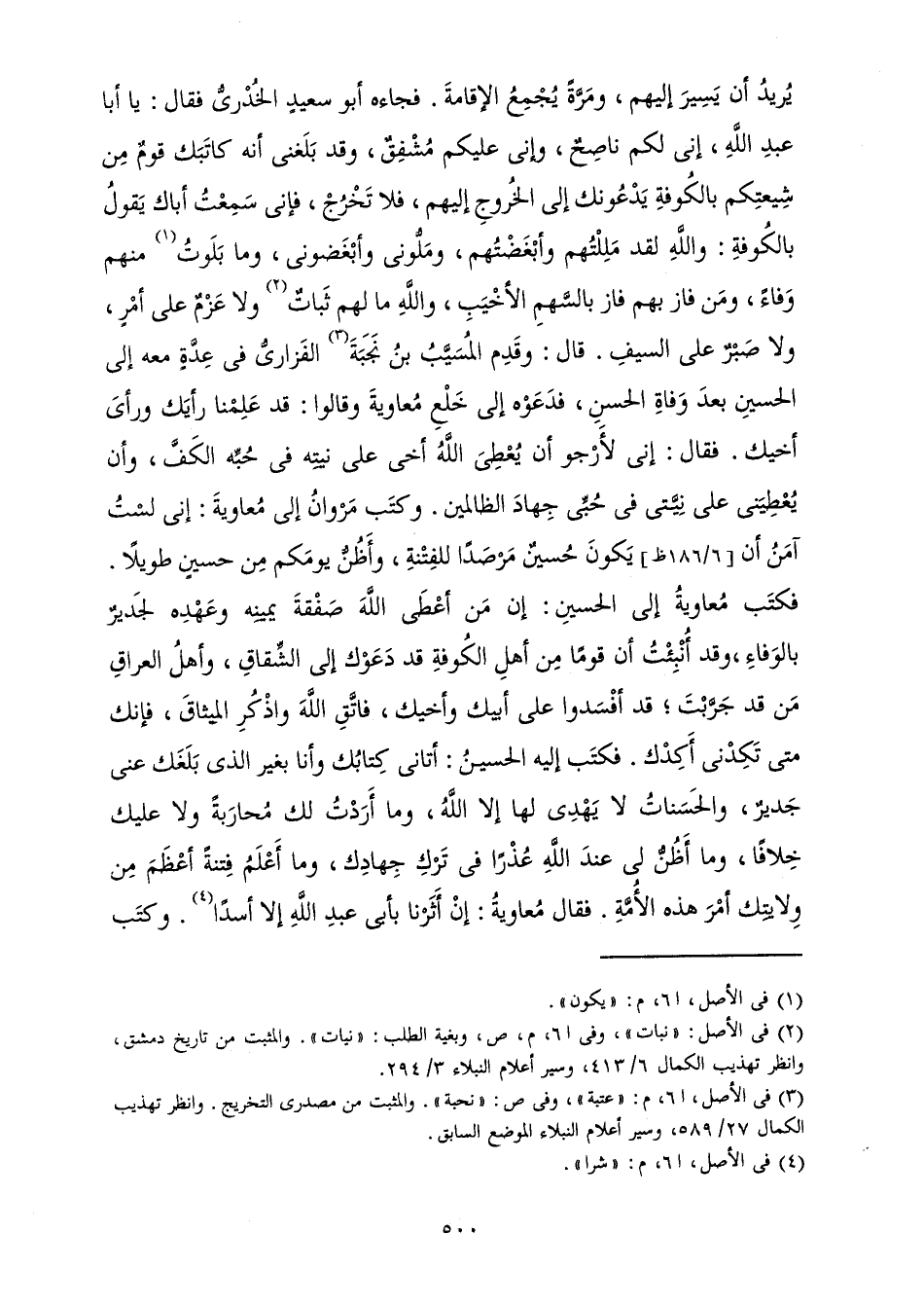 يُرِيدُ أَنْ يَسِيرَ إِلَيْهِمْ، وَمَرَّةً يُجْمِعُ الْإِقَامَةَ. فَجَاءَهُ أَبُو سَعِيدٍ الْخُدْرِيُّ فَقَالَ: يَا أَبَا عَبْدِ اللَّهِ، إِنِّي لَكُمْ نَاصِحٌ، وَإِنِّي عَلَيْكُمْ مُشْفِقٌ، وَقَدْ بَلَغَنِي أَنَّهُ كَاتَبَكَ قَوْمٌ مِنْ شِيعَتِكُمْ بِالْكُوفَةِ يَدْعُونَكَ إِلَى الْخُرُوجِ إِلَيْهِمْ، فَلَا تَخْرُجْ، فَإِنِّي سَمِعْتُ أَبَاكَ يَقُولُ بِالْكُوفَةِ: وَاللَّهِ لَقَدْ مَلِلْتُهُمْ وَأَبْغَضْتُهُمْ، وَمَلُّونِي وَأَبْغَضُونِي، وَمَا بَلَوْتُ مِنْهُمْ وَفَاءً، وَمَنْ فَازَ بِهِمْ فَازَ بِالسَّهْمِ الْأَخْيَبِ، وَاللَّهِ مَا لَهُمْ ثَبَاتٌ وَلَا عَزْمٌ عَلَى أَمْرٍ، وَلَا صَبْرٌ عَلَى السَّيْفِ. قَالَ: وَقَدِمَ الْمُسَيَّبُ بْنُ نَجَبَةَ الْفَزَارِيُّ فِي عِدَّةٍ مَعَهُ إِلَى الْحُسَيْنِ بَعْدَ وَفَاةِ الْحَسَنِ، فَدَعَوْهُ إِلَى خَلْعِ مُعَاوِيَةَ وَقَالُوا: قَدْ عَلِمْنَا رَأْيَكَ وَرَأْيَ أَخِيكَ. فَقَالَ: إِنِّي لَأَرْجُوَ أَنْ يُعْطِيَ اللَّهُ أَخِي عَلَى نِيَّتِهِ فِي حُبِّهِ الْكَفَّ، وَأَنْ يُعْطِيَنِي عَلَى نِيَّتِي فِي حُبِّي جِهَادَ الظَّالِمِينَ. وَكَتَبَ مَرْوَانُ إِلَى مُعَاوِيَةَ: إِنِّي لَسْتُ آمَنُ أَنْ يَكُونَ حُسَيْنٌ مَرْصَدًا لِلْفِتْنَةِ، وَأَظُنُّ يَوْمَكُمْ مِنْ حُسَيْنٍ طَوِيلًا. فَكَتَبَ مُعَاوِيَةُ إِلَى الْحُسَيْنِ: إِنَّ مَنْ أَعْطَى اللَّهَ صَفْقَةَ يَمِينِهِ وَعَهْدِهِ لَجَدِيرٌ بِالْوَفَاءِ، وَقَدْ أُنْبِئْتُ أَنَّ قَوْمًا مِنْ أَهْلِ الْكُوفَةِ قَدْ دَعَوْكَ إِلَى الشِّقَاقِ، وَأَهْلُ الْعِرَاقِ مَنْ قَدْ جَرَّبْتَ ; قَدْ أَفْسَدُوا عَلَى أَبِيكَ وَأَخِيكَ، فَاتَّقِ اللَّهَ وَاذْكُرِ الْمِيثَاقَ ; فَإِنَّكَ مَتَى تَكِدْنِي أَكِدْكَ. فَكَتَبَ إِلَيْهِ الْحُسَيْنُ: أَتَانِي كِتَابُكَ وَأَنَا بِغَيْرِ الَّذِي بَلَغَكَ عَنِّي جَدِيرٌ، وَالْحَسَنَاتُ لَا يَهْدِي لَهَا إِلَّا اللَّهُ، وَمَا أَرَدْتُ لَكَ مُحَارَبَةً وَلَا عَلَيْكَ خِلَافًا، وَمَا أَظُنُّ لِي عِنْدَ اللَّهِ عُذْرًا فِي تَرْكِ جِهَادِكَ، وَمَا أَعْلَمُ فِتْنَةً أَعْظَمَ مِنْ وِلَايَتِكَ أَمْرَ هَذِهِ الْأُمَّةِ. فَقَالَ مُعَاوِيَةُ: إِنَّ أَثَرْنَا بِأَبِي عَبْدِ اللَّهِ إِلَّا أَسَدًا. وَكَتَبَ