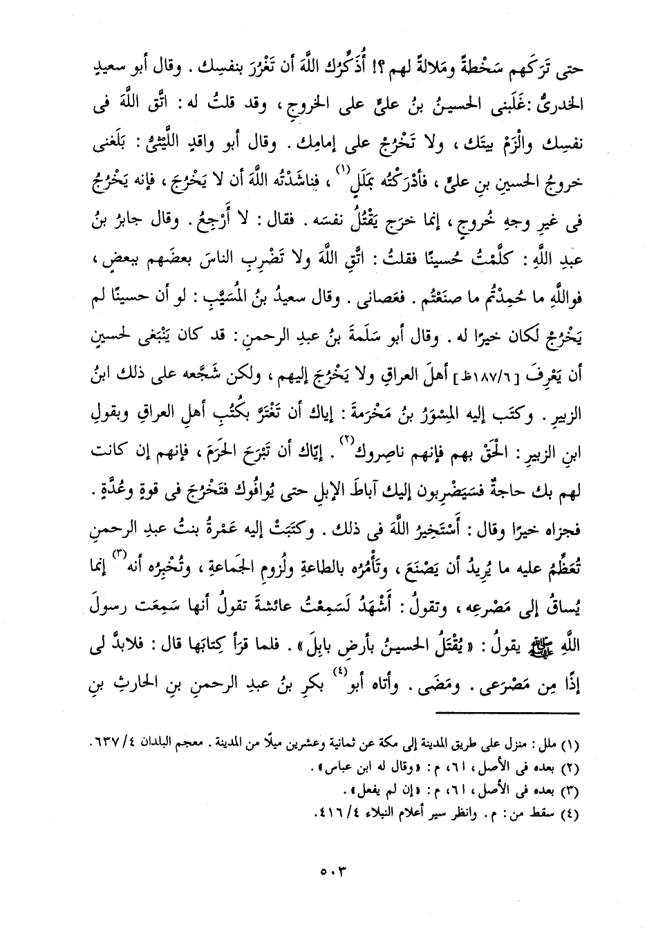 حَتَّى تَرَكَهُمْ سَخْطَةً وَمَلَالَةً لَهُمْ؟ ! أُذَكِّرُكَ اللَّهَ أَنْ تَغْرُرَ بِنَفْسِكَ. وَقَالَ أَبُو سَعِيدٍ الْخُدْرِيُّ: غَلَبَنِي الْحُسَيْنُ بْنُ عَلِيٍّ عَلَى الْخُرُوجِ، وَقَدْ قُلْتُ لَهُ: اتَّقِ اللَّهَ فِي نَفْسِكَ وَالْزَمْ بَيْتَكَ، وَلَا تَخْرُجْ عَلَى إِمَامِكَ. وَقَالَ أَبُو وَاقَدٍ اللِّيثِيُّ: بَلَغَنِي خُرُوجُ الْحُسَيْنِ بْنِ عَلِيٍّ، فَأَدْرَكْتُهُ بِمَلَلٍ، فَنَاشَدْتُهُ اللَّهَ أَنْ لَا يَخْرُجَ، فَإِنَّهُ يَخْرُجُ فِي غَيْرِ وَجْهِ خُرُوجٍ، إِنَّمَا خَرَجَ يَقْتُلُ نَفْسَهُ. فَقَالَ: لَا أَرْجِعُ. وَقَالَ جَابِرُ بْنُ عَبْدِ اللَّهِ: كَلَّمْتُ حُسَيْنًا فَقُلْتُ: اتَّقِ اللَّهَ وَلَا تَضْرِبِ النَّاسَ بَعْضَهُمْ بِبَعْضٍ، فَوَاللَّهِ مَا حُمِدْتُمْ مَا صَنَعْتُمْ. فَعَصَانِي. وَقَالَ سَعِيدُ بْنُ الْمُسَيَّبِ لَوْ أَنَّ حُسَيْنًا لَمْ يَخْرُجْ لَكَانَ خَيْرًا لَهُ. وَقَالَ أَبُو سَلَمَةَ بْنُ عَبْدِ الرَّحْمَنِ: قَدْ كَانَ يَنْبَغِي لِحُسَيْنٍ أَنْ يَعْرِفَ أَهْلَ الْعِرَاقِ وَلَا يَخْرُجُ إِلَيْهِمْ، وَلَكِنْ شَجَّعَهُ عَلَى ذَلِكَ ابْنُ الزُّبَيْرِ. وَكَتَبَ إِلَيْهِ الْمِسْوَرُ بْنُ مَخْرَمَةَ إِيَّاكَ أَنْ تَغْتَرَّ بِكُتُبِ أَهْلِ الْعِرَاقِ وَبِقَوْلِ ابْنِ الزُّبَيْرِ: الْحَقْ بِهِمْ فَإِنَّهُمْ نَاصِرُوكَ. إِيَّاكَ أَنْ تَبْرَحَ الْحَرَمَ، فَإِنَّهُمْ إِنْ كَانَتْ لَهُمْ بِكَ حَاجَةٌ فَسَيَضْرِبُونَ إِلَيْكَ آبَاطَ الْإِبِلِ حَتَّى يُوَافُوكَ فَتَخْرُجَ فِي قُوَّةٍ وَعُدَّةٍ. فَجَزَاهُ خَيْرًا وَقَالَ: أَسْتَخِيرُ اللَّهَ فِي ذَلِكَ. وَكَتَبَتْ إِلَيْهِ عَمْرَةُ بِنْتُ عَبْدِ الرَّحْمَنِ تُعَظِّمُ عَلَيْهِ مَا يُرِيدُ أَنْ يَصْنَعَ، وَتَأْمُرُهُ بِالطَّاعَةِ وَلُزُومِ الْجَمَاعَةِ، وَتُخْبِرُهُ أَنَّهُ إِنَّمَا يُسَاقُ إِلَى مَصْرَعِهِ، وَتَقُولُ: أَشْهَدُ لَسَمِعْتُ عَائِشَةَ تَقُولُ إِنَّهَا سَمِعَتْ رَسُولَ اللَّهِ صَلَّى اللَّهُ عَلَيْهِ وَسَلَّمَ يَقُولُ: " «يُقْتَلُ الْحُسَيْنُ بِأَرْضِ بَابِلَ» ". فَلَمَّا قَرَأَ كِتَابَهَا قَالَ: فَلَا بُدَّ لِي إِذًا مِنْ مَصْرَعِي. وَمَضَى. وَأَتَاهُ أَبُو بَكْرِ بْنُ عَبْدِ الرَّحْمَنِ بْنِ الْحَارِثِ بْنِ