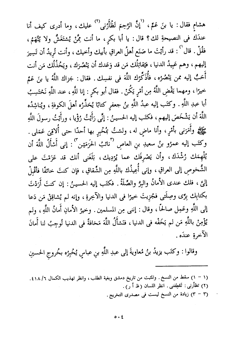 هِشَامٍ فَقَالَ: يا ابْنَ عَمِّ، إِنَّ الرَّحِمَ تَظْأَرُنِي عَلَيْكَ، وَمَا أَدْرِي كَيْفَ أَنَا عِنْدَكَ فِي النَّصِيحَةِ لَكَ؟ قَالَ: يَا أَبَا بَكْرٍ، مَا أَنْتَ مِمَّنْ يُسْتَغَشُّ وَلَا يُتَّهَمُ، فَقُلْ. قَالَ: قَدْ رَأَيْتَ مَا صَنَعَ أَهْلُ الْعِرَاقِ بِأَبِيكَ وَأَخِيكَ، وَأَنْتَ تُرِيدُ أَنْ تَسِيرَ إِلَيْهِمْ، وَهُمْ عَبِيدُ الدُّنْيَا، فَيُقَاتِلُكَ مَنْ قَدْ وَعَدَكَ أَنْ يَنْصُرَكَ، وَيَخْذُلُكَ مَنْ أَنْتَ أَحَبُّ إِلَيْهِ مِمَّنْ يَنْصُرُهُ، فَأُذَكِّرُكَ اللَّهَ فِي نَفْسِكَ. فَقَالَ: جَزَاكَ اللَّهُ يا ابْنَ عَمِّ خَيْرًا، وَمَهْمَا يَقْضِ اللَّهُ مِنْ أَمْرٍ يَكُنْ. فَقَالَ أَبُو بَكْرٍ: إِنَّا لِلَّهِ، عِنْدَ اللَّهِ نَحْتَسِبُ أَبَا عَبْدِ اللَّهِ. وَكَتَبَ إِلَيْهِ عَبْدُ اللَّهِ بْنُ جَعْفَرٍ كِتَابًا يُحَذِّرُهُ أَهْلَ الْكُوفَةِ وَيُنَاشِدُهُ اللَّهَ أَنْ يَشْخَصَ إِلَيْهِمْ، فَكَتَبَ إِلَيْهِ الْحُسَيْنُ: إِنِّي رَأَيْتُ رُؤْيَا، وَرَأَيْتُ رَسُولَ اللَّهِ صَلَّى اللَّهُ عَلَيْهِ وَسَلَّمَ وَأَمَرَنِي بِأَمْرٍ، وَأَنَا مَاضٍ لَهُ، وَلَسْتُ بِمُخْبِرٍ بِهَا أَحَدًا حَتَّى أُلَاقِيَ عَمَلِي. وَكَتَبَ إِلَيْهِ عَمْرُو بْنُ سَعِيدِ بْنِ الْعَاصِ نَائِبُ الْحَرَمَيْنِ: إِنِّي أَسْأَلُ اللَّهَ أَنْ يُلْهِمَكَ رُشْدَكَ، وَأَنْ يَصْرِفَكَ عَمَّا يُرْدِيكَ، بَلَغَنِي أَنَّكَ قَدْ عَزَمْتَ عَلَى الشُّخُوصِ إِلَى الْعِرَاقِ، وَإِنِّي أُعِيذُكَ بِاللَّهِ مِنَ الشِّقَاقِ، فَإِنْ كُنْتَ خَائِفًا فَأَقْبِلْ إِلَيَّ، فَلَكَ عِنْدِي الْأَمَانُ وَالْبِرُّ وَالصِّلَةُ. فَكَتَبَ إِلَيْهِ الْحُسَيْنُ: إِنْ كُنْتَ أَرَدْتَ بِكِتَابِكَ بِرِّي وَصِلَتِي فَجُزِيتَ خَيْرًا فِي الدُّنْيَا وَالْآخِرَةِ، وَإِنَّهُ لَمْ يُشَاقِقْ مَنْ دَعَا إِلَى اللَّهِ وَعَمِلَ صَالَحًا، وَقَالَ: إِنَّنِي مِنَ الْمُسْلِمِينَ. وَخَيْرُ الْأَمَانِ أَمَانُ اللَّهِ، وَلَمْ يُؤْمِنْ بِاللَّهِ مَنْ لَمْ يَخَفْهُ فِي الدُّنْيَا، فَنَسْأَلُ اللَّهَ مَخَافَةً فِي الدُّنْيَا تُوجِبُ لَنَا أَمَانَ الْآخِرَةِ عِنْدَهُ