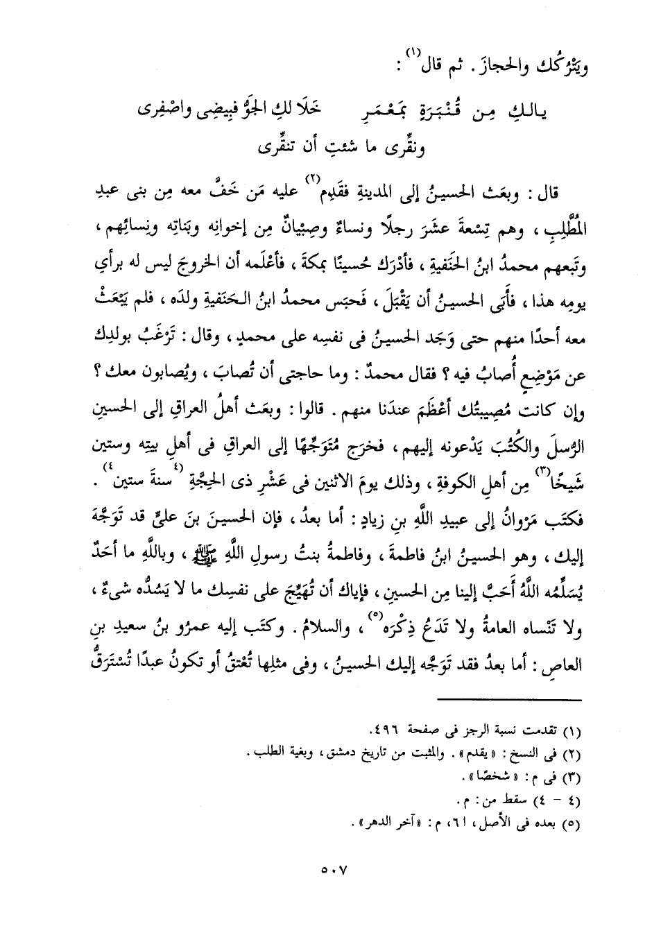 قَالَ: وَبَعَثَ الْحُسَيْنُ إِلَى الْمَدِينَةِ فَقَدِمَ عَلَيْهِ مَنْ خَفَّ مَعَهُ مِنْ بَنِي عَبْدِ الْمُطَّلِبِ، وَهُمْ تِسْعَةَ عَشَرَ رَجُلًا وَنِسَاءٌ وَصِبْيَانٌ مِنْ إِخْوَانِهِ وَبَنَاتِهِ وَنِسَائِهِمْ، وَتَبِعَهُمْ مُحَمَّدُ ابْنُ الْحَنَفِيَّةِ فَأَدْرَكَ حُسَيْنًا بِمَكَّةَ، فَأَعْلَمَهُ أَنَّ الْخُرُوجَ لَيْسَ لَهُ بِرَأْيِ يَوْمِهِ هَذَا، فَأَبَى الْحُسَيْنُ أَنْ يَقْبَلَ، فَحَبَسَ مُحَمَّدُ ابْنُ الْحَنَفِيَّةِ وَلَدَهُ، فَلَمْ يَبْعَثْ مَعَهُ أَحَدًا مِنْهُمْ حَتَّى وَجَدَ الْحُسَيْنُ فِي نَفْسِهِ عَلَى مُحَمَّدٍ، وَقَالَ: تَرْغَبُ بِوَلَدِكَ عَنْ مَوْضِعٍ أُصَابُ فِيهِ؟ فَقَالَ مُحَمَّدٌ: وَمَا حَاجَتِي أَنْ تُصَابَ، وَيُصَابُونَ مَعَكَ؟ وَإِنْ كَانَتْ مُصِيبَتُكَ أَعْظَمَ عِنْدَنَا مِنْهُمْ. قَالُوا: وَبَعَثَ أَهْلُ الْعِرَاقِ إِلَى الْحُسَيْنِ الرُّسُلَ وَالْكُتُبَ يَدْعُونَهُ إِلَيْهِمْ، فَخَرَجَ مُتَوَجِّهًا إِلَى الْعِرَاقِ فِي أَهْلِ بَيْتِهِ وَسِتِّينَ شَيْخًا مِنْ أَهْلِ الْكُوفَةِ وَذَلِكَ يَوْمَ الِاثْنَيْنِ فِي عَشْرِ ذِي الْحِجَّةِ سَنَةَ سِتِّينَ. فَكَتَبَ مَرْوَانُ إِلَى عُبَيْدِ اللَّهِ بْنِ زِيَادٍ: أَمَّا بَعْدُ، فَإِنَّ الْحُسَيْنَ بْنَ عَلِيٍّ قَدْ تَوَجَّهَ إِلَيْكَ، وَهُوَ الْحُسَيْنُ ابْنُ فَاطِمَةَ، وَفَاطِمَةُ بِنْتُ رَسُولِ اللَّهِ صَلَّى اللَّهُ عَلَيْهِ وَسَلَّمَ، وَبِاللَّهِ مَا أَحَدٌ يُسَلِّمُهُ اللَّهُ أَحَبَّ إِلَيْنَا مِنَ الْحُسَيْنِ، فَإِيَّاكَ أَنْ تُهَيِّجَ عَلَى نَفْسِكَ مَا لَا يَسُدُّهُ شَيْءٌ، وَلَا تَنْسَاهُ الْعَامَّةُ وَلَا تَدَعُ ذِكْرَهُ، وَالسَّلَامُ. وَكَتَبَ إِلَيْهِ عَمْرُو بْنُ سَعِيدِ بْنِ الْعَاصِ: أَمَّا بَعْدُ فَقَدْ تَوَجَّهَ إِلَيْكَ الْحُسَيْنُ، وَفِي مِثْلِهَا تُعْتَقُ أَوْ تَكُونُ عَبْدًا تُسْتَرَقُّ