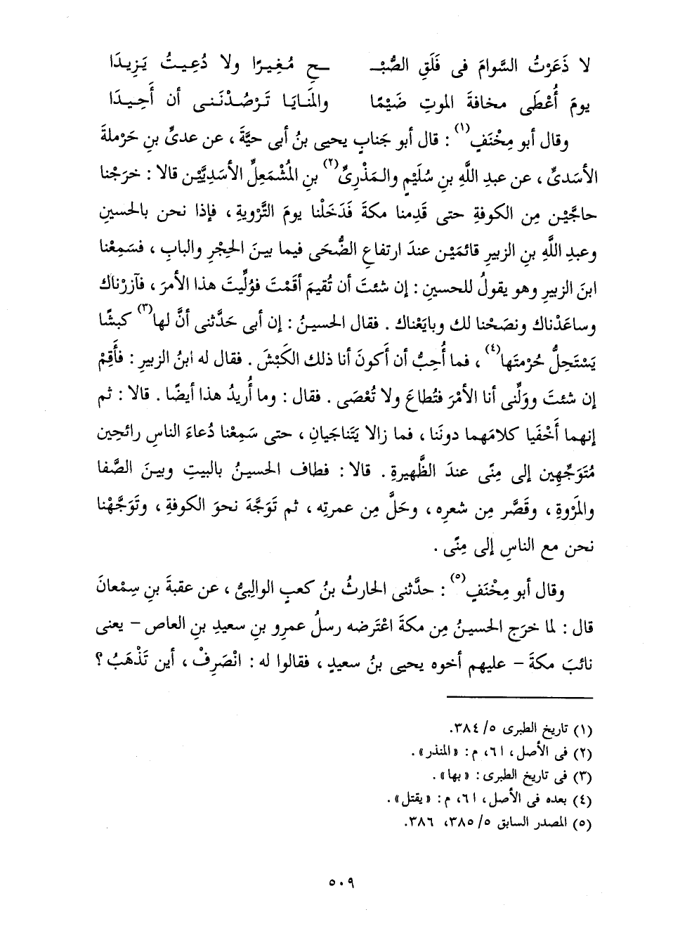 وَقَالَ أَبُو مِخْنَفٍ: قَالَ أَبُو جَنَابٍ يَحْيَى بْنُ أَبِي حَيَّةَ، عَنْ عَدِيِّ بْنِ حَرْمَلَةَ الْأَسَدِيِّ، عَنْ عَبْدِ اللَّهِ بْنِ سُلَيْمٍ وَالْمَذْرِيِّ بْنِ الْمُشْمَعِلِّ الْأَسَدِيَّيْنِ قَالَا: خَرَجْنَا حَاجَّيْنَ مِنَ الْكُوفَةِ حَتَّى قَدِمْنَا مَكَّةَ فَدَخَلْنَا يَوْمَ التَّرْوِيَةِ، فَإِذَا نَحْنُ بِالْحُسَيْنِ وَعَبْدِ اللَّهِ بْنِ الزُّبَيْرِ قَائِمَيْنِ عِنْدَ ارْتِفَاعِ الضُّحَى فِيمَا بَيْنَ الْحِجْرِ وَالْبَابِ، فَسَمِعْنَا ابْنَ الزُّبَيْرِ وَهُوَ يَقُولُ لِلْحُسَيْنِ: إِنْ شِئْتَ أَنْ تُقِيمَ أَقَمْتَ فَوُلِّيتَ هَذَا الْأَمْرَ، فَآزَرْنَاكَ وَسَاعَدْنَاكَ وَنَصَحْنَا لَكَ وَبَايَعْنَاكَ. فَقَالَ الْحُسَيْنُ: إِنَّ أَبِي حَدَّثَنِي أَنَّ لَهَا كَبْشًا يَسْتَحِلُّ حُرْمَتَهَا، فَمَا أُحِبُّ أَنْ أَكُونَ أَنَا ذَلِكَ الْكَبْشَ. فَقَالَ لَهُ ابْنُ الزُّبَيْرِ: فَأَقِمْ إِنْ شِئْتَ وَوَلِّنِي أَنَا الْأَمْرَ فَتُطَاعَ وَلَا تُعْصَى. فَقَالَ: وَمَا أُرِيدُ هَذَا أَيْضًا. قَالَا: ثُمَّ إِنَّهُمَا أَخْفَيَا كَلَامَهُمَا دُونَنَا، فَمَا زَالَا يَتَنَاجَيَانِ، حَتَّى سَمِعْنَا دُعَاءَ النَّاسِ رَائِحِينَ مُتَوَجِّهِينَ إِلَى مِنًى عِنْدَ الظَّهِيرَةِ. قَالَا: فَطَافَ الْحُسَيْنُ بِالْبَيْتِ وَبَيْنَ الصَّفَا وَالْمَرْوَةِ، وَقَصَّرَ مِنْ شِعْرِهِ، وَحَلَّ مِنْ عُمْرَتِهِ، ثُمَّ تَوَجَّهَ نَحْوَ الْكُوفَةِ، وَتَوَجَّهْنَا نَحْنُ مَعَ النَّاسِ إِلَى مِنًى.