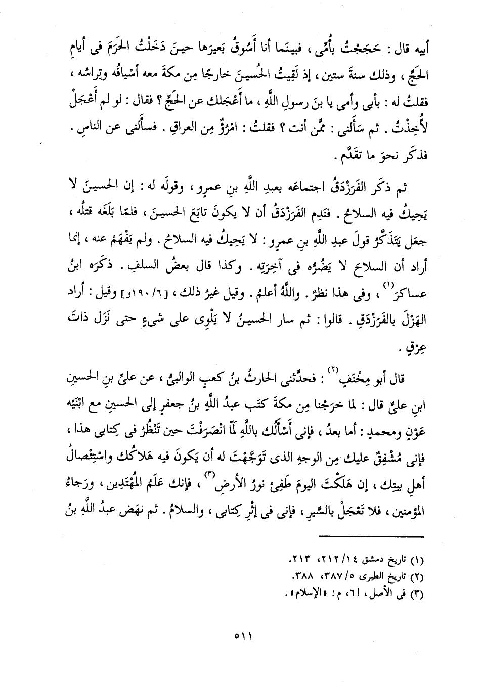 أَبِيهِ قَالَ: حَجَجْتُ بِأُمِّي، فَبَيْنَمَا أَنَا أَسُوقُ بَعِيرَهَا حِينَ دَخَلْتُ الْحَرَمَ فِي أَيَّامِ الْحَجِّ، وَذَلِكَ سَنَةَ سِتِّينَ، إِذْ لَقِيتُ الْحُسَيْنَ خَارِجًا مِنْ مَكَّةَ مَعَهُ أَسْيَافُهُ وَتِرَاسُهُ، فَقُلْتُ لَهُ: بِأَبِي وَأُمِّي يَا ابْنَ رَسُولِ اللَّهِ، مَا أَعْجَلَكَ عَنِ الْحَجِّ؟ فَقَالَ: لَوْ لَمْ أَعْجَلْ لَأُخِذْتُ. ثُمَّ سَأَلَنِي: مِمَّنْ أَنْتَ؟ فَقُلْتُ: امْرُؤٌ مِنَ الْعِرَاقِ. فَسَأَلَنِي عَنِ النَّاسِ. فَذَكَرَ نَحْوَ مَا تَقَدَّمَ.