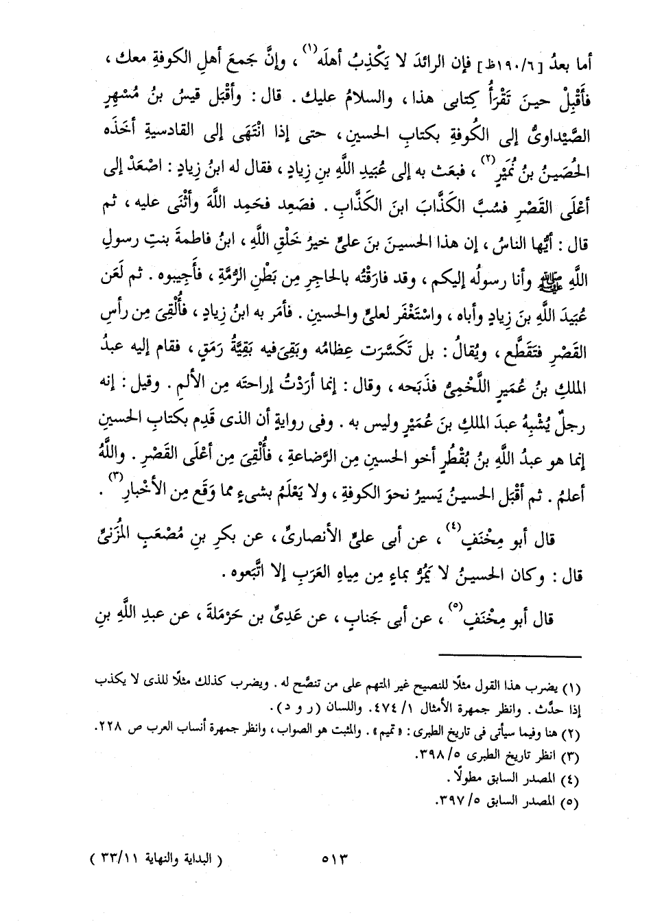 أَمَّا بَعْدُ فَإِنَّ الرَّائِدَ لَا يَكْذِبُ أَهْلَهُ، وَإِنَّ جَمِيعَ أَهْلِ الْكُوفَةِ مَعَكَ، فَأَقْبِلْ حِينَ تَقْرَأُ كِتَابِي هَذَا، وَالسَّلَامُ عَلَيْكَ. قَالَ: وَأَقْبَلَ قَيْسُ بْنُ مُسْهِرٍ الصَّيْدَاوِيُّ إِلَى الْكُوفَةِ بِكِتَابِ الْحُسَيْنِ، حَتَّى إِذَا انْتَهَى إِلَى الْقَادِسِيَّةِ أَخَذَهُ الْحُصَيْنُ بْنُ نُمَيْرٍ، فَبَعَثَ بِهِ إِلَى عُبَيْدِ اللَّهِ بْنِ زِيَادٍ، فَقَالَ لَهُ ابْنُ زِيَادٍ: اصْعَدْ إِلَى أَعْلَى الْقَصْرِ فَسُبَّ الْكَذَّابَ ابْنَ الْكَذَّابِ. فَصَعِدَ فَحَمِدَ اللَّهَ وَأَثْنَى عَلَيْهِ، ثُمَّ قَالَ: أَيُّهَا النَّاسُ، إِنَّ هَذَا الْحُسَيْنَ بْنَ عَلِيٍّ خَيْرُ خَلْقِ اللَّهِ، ابْنُ فَاطِمَةَ بِنْتِ رَسُولِ اللَّهِ صَلَّى اللَّهُ عَلَيْهِ وَسَلَّمَ وَأَنَا رَسُولُهُ إِلَيْكُمْ، وَقَدْ فَارَقْتُهُ بِالْحَاجِزِ مِنْ بَطْنِ الرُّمَّةِ، فَأَجِيبُوهُ. ثُمَّ لَعَنَ عُبَيْدَ اللَّهِ بْنَ زِيَادٍ وَأَبَاهُ، وَاسْتَغْفَرَ لِعَلِيٍّ وَالْحُسَيْنِ. فَأَمَرَ بِهِ ابْنُ زِيَادٍ، فَأُلْقِيَ مِنْ رَأَسِ الْقَصْرِ فَتَقَطَّعَ، وَيُقَالُ: بَلْ تَكَسَّرَتْ عِظَامُهُ وَبَقِيَ فِيهِ بَقِيَّةُ رَمَقٍ، فَقَامَ إِلَيْهِ عَبْدُ الْمَلِكِ بْنُ عُمَيْرٍ اللَّخْمِيُّ فَذَبَحَهُ، وَقَالَ: إِنَّمَا أَرَدْتُ إِرَاحَتَهُ مِنَ الْأَلَمِ. وَقِيلَ: إِنَّهُ رَجُلٌ يُشْبِهُ عَبْدَ الْمَلِكِ بْنَ عُمَيْرٍ وَلَيْسَ بِهِ. وَفِي رِوَايَةٍ أَنَّ الَّذِي قَدِمَ بِكِتَابِ الْحُسَيْنِ إِنَّمَا هُوَ عَبْدُ اللَّهِ بْنُ بُقْطُرٍ أَخُو الْحُسَيْنِ مِنَ الرَّضَاعَةِ، فَأُلْقِيَ مِنْ أَعْلَى الْقَصْرِ. وَاللَّهُ أَعْلَمُ. ثُمَّ أَقْبَلَ الْحُسَيْنُ يَسِيرُ نَحْوَ الْكُوفَةِ، وَلَا يَعْلَمُ بِشَيْءٍ مِمَّا وَقَعَ مِنَ الْأَخْبَارِ.