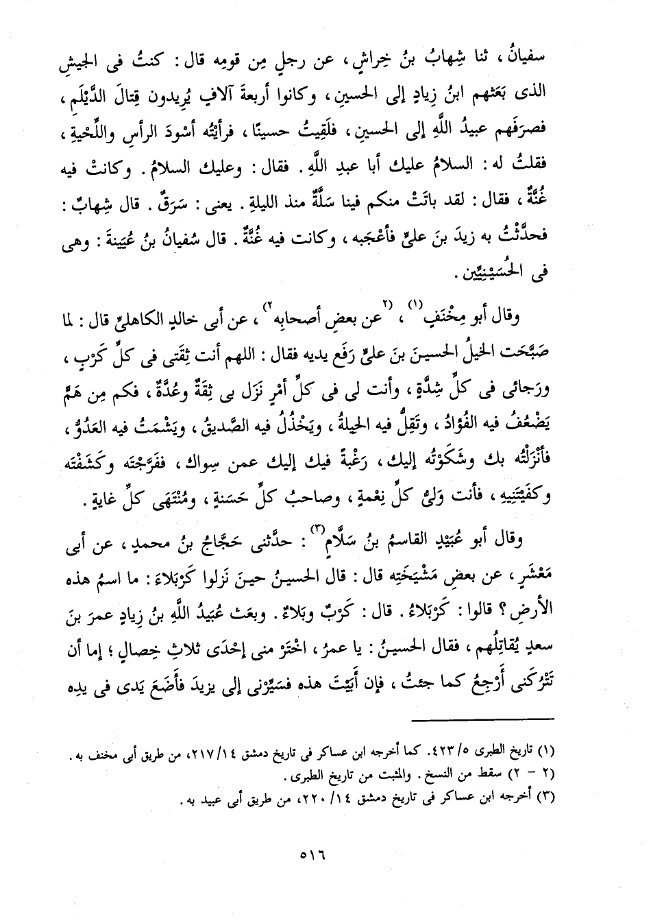 سُفْيَانُ، ثَنَا شِهَابُ بْنُ خِرَاشٍ، عَنْ رَجُلٍ مِنْ قَوْمِهِ قَالَ: كُنْتُ فِي الْجَيْشِ الَّذِي بَعَثَهُمُ ابْنُ زِيَادٍ إِلَى الْحُسَيْنِ، وكَانُوا أَرْبَعَةَ آلَافٍ يُرِيدُونَ قِتَالَ الدَّيْلَمِ، فَصَرَفَهُمْ عُبَيْدُ اللَّهِ إِلَى الْحُسَيْنِ، فَلَقِيتُ حُسَيْنًا، فَرَأَيْتُهُ أَسْوَدَ الرَّأْسِ وَاللِّحْيَةِ، فَقُلْتُ لَهُ: السَّلَامُ عَلَيْكَ أَبَا عَبْدِ اللَّهِ. فَقَالَ: وَعَلَيْكَ السَّلَامُ. وَكَانَتْ فِيهِ غُنَّةٌ، فَقَالَ: لَقَدْ بَاتَتْ مِنْكُمْ فِينَا سَلَّةٌ مُنْذُ اللَّيْلَةِ. يَعْنِي: سَرَقٌ. قَالَ شِهَابٌ: فَحَدَّثْتُ بِهِ زَيْدَ بْنَ عَلِيٍّ فَأَعْجَبَهُ، وَكَانَتْ فِيهِ غُنَّةٌ. قَالَ سُفْيَانُ بْنُ عُيَيْنَةَ: وَهِيَ فِي الْحُسَيْنِيَّيْنِ.