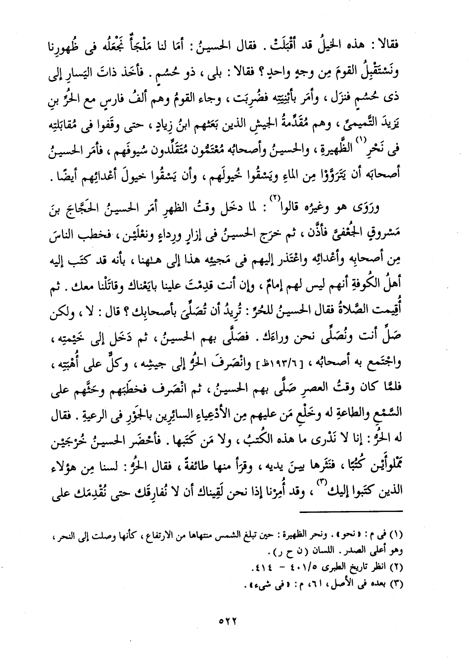 فَقَالَا: هَذِهِ الْخَيْلُ قَدْ أَقْبَلَتْ. فَقَالَ الْحُسَيْنُ: أَمَا لَنَا مَلْجَأٌ نَجْعَلُهُ فِي ظُهُورِنَا وَنَسْتَقْبِلُ الْقَوْمَ مِنْ وَجْهٍ وَاحِدٍ؟ فَقَالَا: بَلَى، ذُو حُسُمٍ. فَأَخَذَ ذَاتَ الْيَسَارِ إِلَى ذِي حُسُمٍ فَنَزَلَ، وَأَمَرَ بِأَبْنِيَتِهِ فَضُرِبَتْ، وَجَاءَ الْقَوْمُ وَهُمْ أَلْفُ فَارِسٍ مَعَ الْحُرِّ بْنِ يَزِيدَ التَّمِيمِيِّ، وَهُمْ مُقَدِّمَةُ الْجَيْشِ الَّذِينَ بَعَثَهُمُ ابْنُ زِيَادٍ، حَتَّى وَقَفُوا فِي مُقَابَلَتِهِ فِي نَحْرِ الظَّهِيرَةِ، وَالْحُسَيْنُ وَأَصْحَابُهُ مُعْتَمُّونَ مُتَقَلِّدُونَ سُيُوفَهُمْ، فَأَمَرَ الْحُسَيْنُ أَصْحَابَهُ أَنْ يَتَرَوَّوْا مِنَ الْمَاءِ وَيَسْقُوا خُيُولَهُمْ، وَأَنْ يَسْقُوا خُيُولَ أَعْدَائِهِمْ أَيْضًا.
