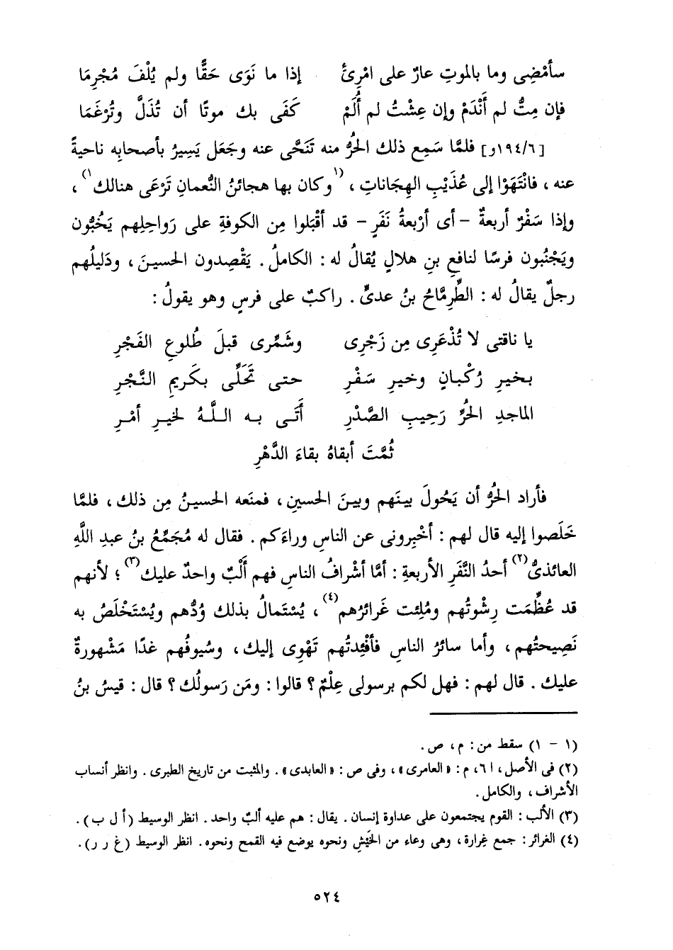 فَلَمَّا سَمِعَ ذَلِكَ الْحُرُّ مِنْهُ تَنَحَّى عَنْهُ وَجَعَلَ يَسِيرُ بِأَصْحَابِهِ نَاحِيَةً عَنْهُ، فَانْتَهَوْا إِلَى عُذَيْبِ الْهِجَانَاتِ، وَكَانَ بِهَا هَجَائِنُ النُّعْمَانِ تَرْعَى هُنَالِكَ، وَإِذَا سَفْرٌ أَرْبَعَةٌ - أَيْ أَرْبَعَةُ نَفَرٍ - قَدْ أَقْبَلُوا مِنَ الْكُوفَةِ عَلَى رَوَاحِلِهِمْ يَخُبُّونَ وَيَجْنُبُونَ فَرَسًا لِنَافِعِ بْنِ هِلَالٍ يُقَالُ لَهُ: الْكَامِلُ. يَقْصِدُونَ الْحُسَيْنَ، وَدَلِيلُهُمْ رَجُلٌ يُقَالُ لَهُ: الطِّرِمَّاحُ بْنُ عَدِيٍّ. رَاكِبٌ عَلَى فَرَسٍ وَهُوَ يَقُولُ: