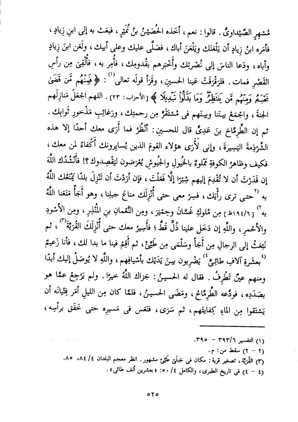 مُسْهِرٍ الصَّيْدَاوِيُّ. قَالُوا: نَعَمْ، أَخَذَهُ الْحُصَيْنُ بْنُ نُمَيْرٍ، فَبَعَثَ بِهِ إِلَى ابْنِ زِيَادٍ، فَأَمَرَهُ ابْنُ زِيَادٍ أَنْ يَلْعَنَكَ وَيَلْعَنَ أَبَاكَ، فَصَلَّى عَلَيْكَ وَعَلَى أَبِيكَ، وَلَعَنَ ابْنَ زِيَادٍ وَأَبَاهُ، وَدَعَا النَّاسَ إِلَى نُصْرَتِكَ وَأَخْبَرَهُمْ بِقُدُومِكَ، فَأَمَرَ بِهِ، فَأُلْقِيَ مِنْ رَأَسَ الْقَصْرِ فَمَاتَ. فَتَرَقْرَقَتْ عَيْنَا الْحُسَيْنِ، وَقَرَأَ قَوْلَهُ تَعَالَى: {فَمِنْهُمْ مَنْ قَضَى نَحْبَهُ وَمِنْهُمْ مَنْ يَنْتَظِرُ وَمَا بَدَّلُوا تَبْدِيلًا} [الأحزاب: 23] . اللَّهُمَّ اجْعَلْ مَنَازِلَهُمُ الْجَنَّةَ، وَاجْمَعْ بَيْنَنَا وَبَيْنَهُمْ فِي مُسْتَقَرٍّ مِنْ رَحْمَتِكَ، وَرَغَائِبِ مَذْخُورِ ثَوَابِكَ. ثُمَّ إِنَّ الطِّرِمَّاحَ بْنَ عَدِيٍّ قَالَ لِلْحُسَيْنِ: أَنْظُرُ فَمَا أَرَى مَعَكَ أَحَدًا إِلَّا هَذِهِ الشِّرْذِمَةَ الْيَسِيرَةَ، وَإِنِّي لَأَرَى هَؤُلَاءِ الْقَوْمَ الَّذِينَ يُسَايِرُونَكَ أَكْفَاءً لِمَنْ مَعَكَ، فَكَيْفَ وَظَاهِرُ الْكُوفَةِ مَمْلُوءٌ بِالْخُيُولِ وَالْجُيُوشِ يُعْرَضُونَ لِيَقْصِدُوكَ؟ ! فَأَنْشُدُكَ اللَّهَ إِنْ قَدَرْتَ أَنْ لَا تُقْدِمَ إِلَيْهِمْ شِبْرًا إِلَّا فَعَلْتَ، فَإِنْ أَرَدْتَ أَنْ تَنْزِلَ بَلَدًا يَمْنَعُكَ اللَّهُ بِهِ حَتَّى تَرَى رَأْيَكَ، فَسِرْ مَعِي حَتَّى أُنْزِلَكَ مَنَاعَ جَبَلِنَا، وَهُوَ أَجَأٌ مَنَعَنَا اللَّهُ بِهِ مِنْ مُلُوكِ غَسَّانَ وَحِمْيَرَ، وَمِنَ النُّعْمَانِ بْنِ الْمُنْذِرِ، وَمِنَ الْأَسْوَدِ وَالْأَحْمَرِ، وَاللَّهِ إِنْ دَخَلَ عَلَيْنَا ذُلٌّ قَطُّ ; فَأَسِيرُ مَعَكَ حَتَّى أُنْزِلَكَ الْقُرَيَّةَ، ثُمَّ نَبْعَثُ إِلَى الرِّجَالِ مِنْ أَجَأَ وَسَلْمَى مِنْ طَيِّئٍ، ثُمَّ أَقِمْ فِينَا مَا بَدَا لَكَ، فَأَنَا زَعِيمٌ بِعَشَرَةِ آلَافِ طَائِيٍّ يَضْرِبُونَ بَيْنَ يَدَيْكَ بِأَسْيَافِهِمْ، وَاللَّهِ لَا يُوصَلُ إِلَيْكَ أَبَدًا وَمِنْهُمْ عَيْنٌ تَطْرِفُ. فَقَالَ لَهُ الْحُسَيْنُ: جَزَاكَ اللَّهُ خَيْرًا. وَلَمْ يَرْجِعْ عَمَّا هُوَ بِصَدَدِهِ، فَوَدَّعَهُ الطِّرِمَّاحُ، وَمَضَى الْحُسَيْنُ، فَلَمَّا كَانَ مِنَ اللَّيْلِ أَمَرَ فِتْيَانَهُ أَنْ يَسْتَقُوا مِنَ الْمَاءِ كِفَايَتَهُمْ، ثُمَّ سَرَى، فَنَعَسَ فِي مَسِيرِهِ حَتَّى خَفَقَ بِرَأْسِهِ،