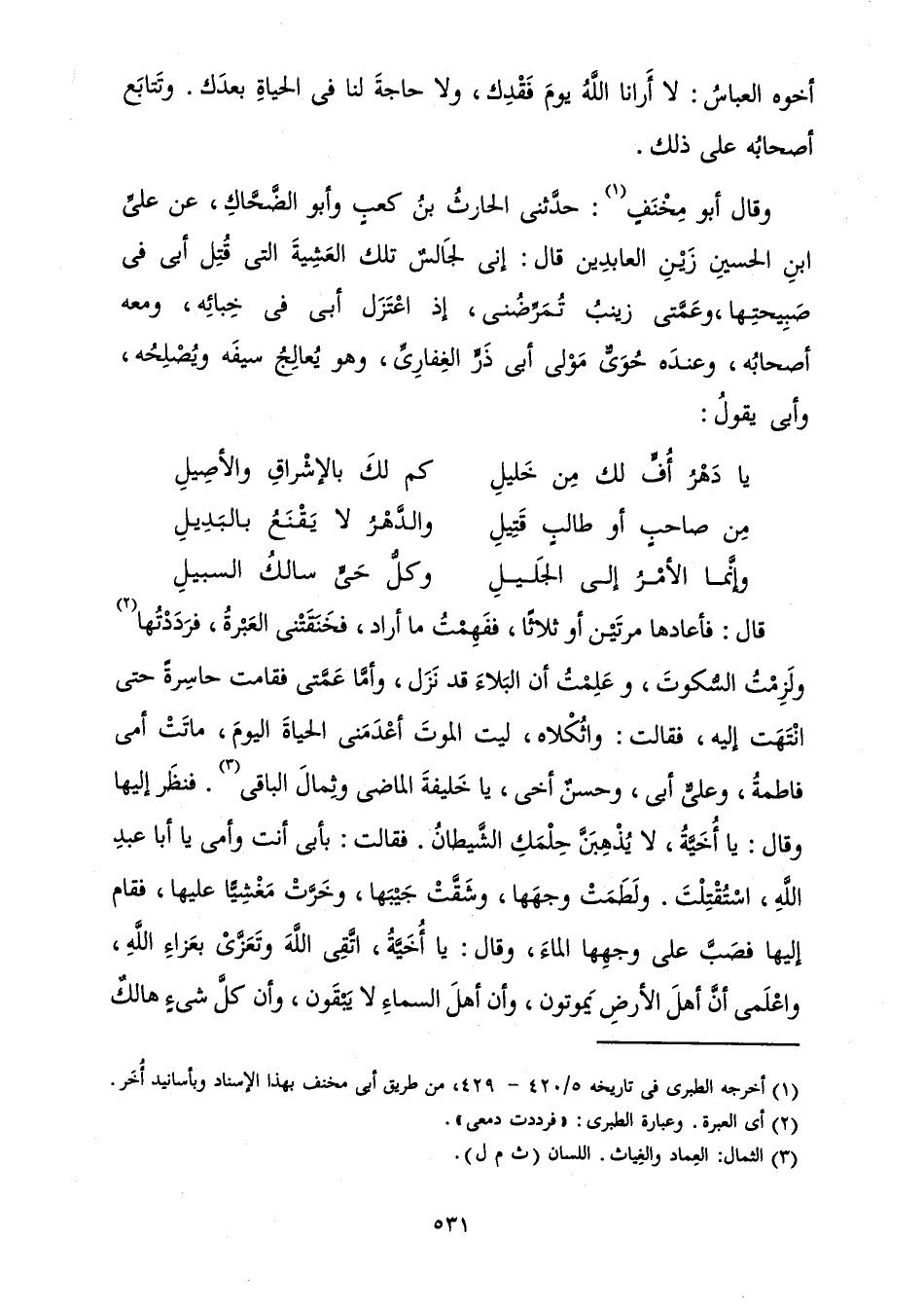 قَالَ: فَأَعَادَهَا مَرَّتَيْنِ أَوْ ثَلَاثًا، فَفَهِمْتُ مَا أَرَادَ، فَخَنَقَتْنِي الْعَبْرَةُ، فَرَدَدْتُهَا وَلَزِمْتُ السُّكُوتَ، وَعَلِمْتُ أَنَّ الْبَلَاءَ قَدْ نَزَلَ، وَأَمَّا عَمَّتِي فَقَامْتَ حَاسِرَةً حَتَّى انْتَهَتْ إِلَيْهِ، فَقَالَتْ: وَاثُكْلَاهُ، لَيْتَ الْمَوْتَ أَعْدَمَنِي الْحَيَاةَ الْيَوْمَ، مَاتَتْ أُمِّي فَاطِمَةُ، وَعَلِيٌّ أَبِي، وَحَسَنٌ أَخِي، يَا خَلِيفَةَ الْمَاضِي وَثِمَالَ الْبَاقِي. فَنَظَرَ إِلَيْهَا وَقَالَ: يَا أُخَيَّةُ، لَا يُذْهِبَنَّ حِلْمُكِ الشَّيْطَانُ. فَقَالَتْ: بِأَبِي أَنْتَ وَأُمِّي يَا أَبَا عَبْدِ اللَّهِ، اسْتُقْتِلْتَ. وَلَطَمَتْ وَجْهَهَا، وَشَقَّتْ جَيْبَهَا، وَخَرَّتْ مَغْشِيًّا عَلَيْهَا، فَقَامَ إِلَيْهَا فَصَبَّ عَلَى وَجْهِهَا الْمَاءَ، وَقَالَ: يَا أُخَيَّةُ، اتَّقِي اللَّهَ وَتَعَزِّي بِعَزَاءِ اللَّهِ، وَاعْلَمِي أَنَّ أَهْلَ الْأَرْضِ يَمُوتُونَ، وَأَنَّ أَهْلَ السَّمَاءِ لَا يَبْقَوْنَ، وَأَنَّ كُلَّ شَيْءٍ هَالِكٌ