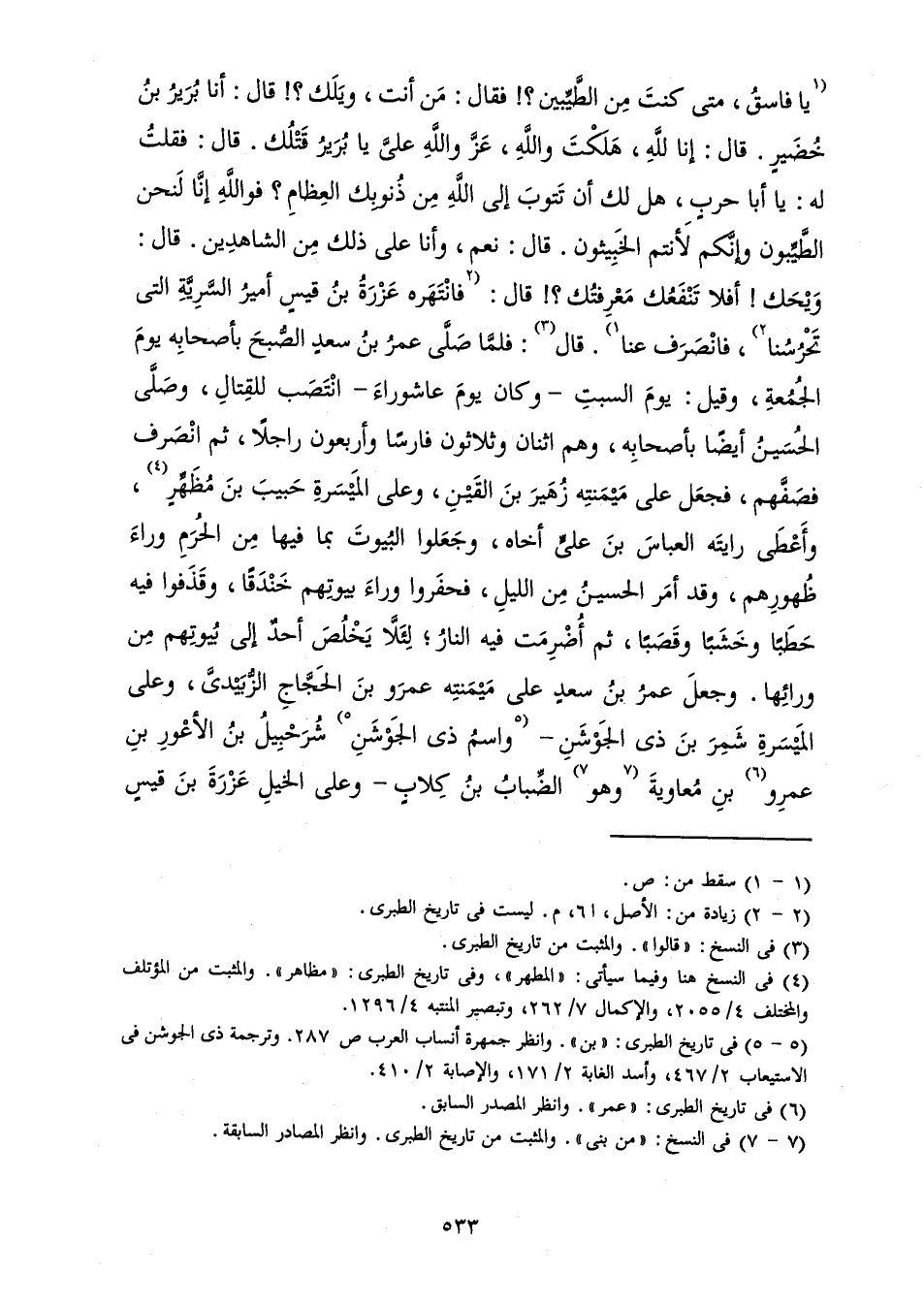 يَا فَاسِقُ، مَتَى كُنْتَ مِنَ الطَّيِّبِينَ؟ ! فَقَالَ: مَنْ أَنْتَ، وَيْلَكَ؟ ! قَالَ: أَنَا بُرَيْرُ بْنُ خُضَيْرٍ. قَالَ: إِنَّا لِلَّهِ، هَلَكْتَ وَاللَّهِ، عَزَّ وَاللَّهِ عَلَيَّ يَا بُرَيْرُ قَتْلَكَ. قَالَ: فَقُلْتُ لَهُ: يَا أَبَا حَرْبٍ، هَلْ لَكَ أَنْ تَتُوبَ إِلَى اللَّهِ مِنْ ذُنُوبِكَ الْعِظَامِ؟ فَوَاللَّهِ إِنَّا لَنَحْنُ الطَّيِّبُونَ وَإِنَّكُمْ لَأَنْتُمُ الْخِبِيثُونَ. قَالَ: نَعَمْ، وَأَنَا عَلَى ذَلِكَ مِنَ الشَّاهِدَيْنِ. قَالَ: وَيْحَكَ! أَفَلَا تَنْفَعُكَ مَعْرِفَتُكَ؟ ! قَالَ: فَانْتَهَرَهُ عَزْرَةُ بْنُ قَيْسٍ أَمِيرُ السَّرِيَّةِ الَّتِي تَحْرُسُنَا، فَانْصَرَفَ عَنَّا. قَالَ: فَلَمَّا صَلَّى عُمَرُ بْنُ سَعْدٍ الصُّبْحَ بِأَصْحَابِهِ يَوْمَ الْجُمُعَةِ، وَقِيلَ: يَوْمَ السَّبْتِ - وَكَانَ يَوْمَ عَاشُورَاءَ - انْتَصَبَ لِلْقِتَالِ، وَصَلَّى الْحُسَيْنُ أَيْضًا بِأَصْحَابِهِ، وَهُمُ اثَنَانِ وَثَلَاثُونَ فَارِسًا وَأَرْبَعُونَ رَاجِلًا، ثُمَّ انْصَرَفَ فَصَفَّهُمْ، فَجَعَلَ عَلَى مَيْمَنَتِهِ زُهَيْرَ بْنَ الْقَيْنِ، وَعَلَى الْمَيْسَرَةِ حَبِيبَ بْنَ مُظَهِّرٍ، وَأَعْطَى رَايَتَهُ الْعَبَّاسَ بْنَ عَلِيٍّ أَخَاهُ، وَجَعَلُوا الْبُيُوتَ بِمَا فِيهَا مِنَ الْحَرَمِ وَرَاءَ ظُهُورِهِمْ، وَقَدْ أَمَرَ الْحُسَيْنُ مِنَ اللَّيْلِ، فَحَفَرُوا وَرَاءَ بُيُوتِهِمْ خَنْدَقًا، وَقَذَفُوا فِيهِ حَطَبًا وَخَشَبًا وَقَصَبًا، ثُمَّ أُضْرِمَتْ فِيهِ النَّارُ ; لِئَلَّا يَخْلُصَ أَحَدٌ إِلَى بُيُوتِهِمْ مِنْ وَرَائِهَا. وَجَعَلَ عُمَرُ بْنُ سَعْدٍ عَلَى مَيْمَنَتِهِ عَمْرَو بْنَ الْحَجَّاجِ الزُّبَيْدِيَّ، وَعَلَى الْمَيْسَرَةِ شَمِرَ بْنَ ذِي الْجَوْشَنِ - وَاسْمُ ذِي الْجَوْشَنِ شُرَحْبِيلُ بْنُ الْأَعْوَرِ بْنِ عَمْرِو بْنِ مُعَاوِيَةَ وَهُوَ الضِّبَابُ بْنُ كِلَابٍ - وَعَلَى الْخَيْلِ عَزْرَةَ بْنَ قَيْسٍ