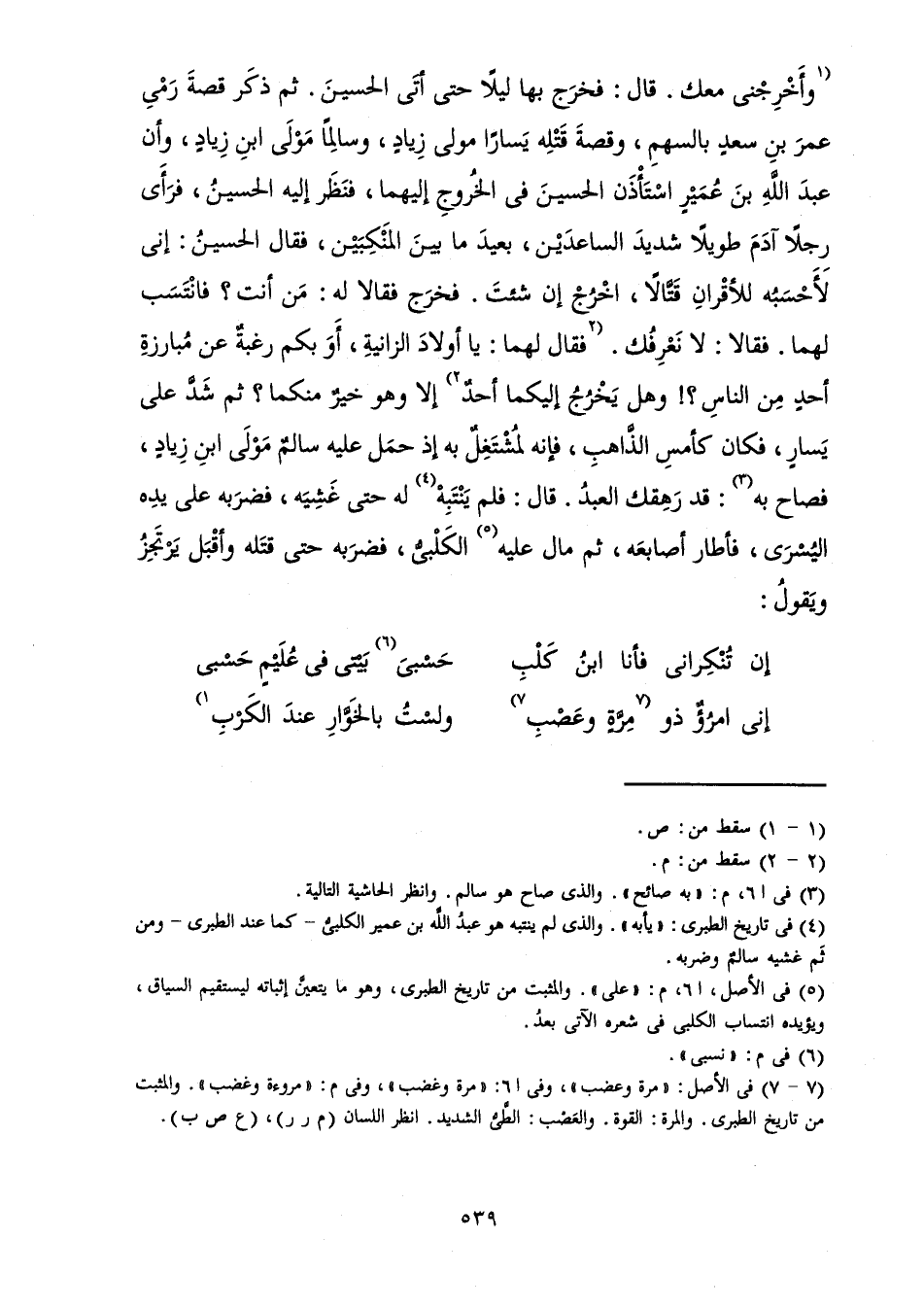 وَأَخْرِجْنِي مَعَكَ. قَالَ: فَخَرَجَ بِهَا لَيْلًا حَتَّى أَتَى الْحُسَيْنَ. ثُمَّ ذَكَرَ قِصَّةَ رَمْيِ عُمَرَ بْنِ سَعْدٍ بِالسَّهْمِ، وَقِصَّةَ قَتْلِهِ يَسَارًا مَوْلَى زِيَادٍ، وَسَالِمًا مَوْلَى ابْنِ زِيَادٍ، وَأَنَّ عَبْدَ اللَّهِ بْنَ عُمَيْرٍ اسْتَأْذَنَ الْحُسَيْنَ فِي الْخُرُوجِ إِلَيْهِمَا، فَنَظَرَ إِلَيْهِ الْحُسَيْنُ، فَرَأَى رَجُلًا آدَمَ طَوِيلًا شَدِيدَ السَّاعِدَيْنِ، بَعِيدَ مَا بَيْنَ الْمَنْكِبَيْنِ، فَقَالَ الْحُسَيْنُ: إِنِّي لَأَحْسَبُهُ لِلْأَقْرَانِ قَتَّالًا، اخْرُجْ إِنْ شِئْتَ. فَخَرَجَ فَقَالَا لَهُ: مَنْ أَنْتَ؟ فَانْتَسَبَ لَهُمَا. فَقَالَا: لَا نَعْرِفُكَ. فَقَالَ لَهُمَا: يَا أَوْلَادَ الزَّانِيَةِ، أَوَ بِكُمْ رَغْبَةٌ عَنْ مُبَارَزَةِ أَحَدٍ مِنَ النَّاسِ؟ ! وَهَلْ يَخْرُجُ إِلَيْكُمَا أَحَدٌ إِلَّا وَهُوَ خَيْرٌ مِنْكُمَا؟ ثُمَّ شَدَّ عَلَى يَسَارٍ، فَكَانَ كَأَمْسِ الذَّاهِبِ، فَإِنَّهُ لَمُشْتَغِلٌ بِهِ إِذْ حَمَلَ عَلَيْهِ سَالِمٌ مَوْلَى ابْنِ زِيَادٍ، فَصَاحَ بِهِ: قَدْ رَهِقَكَ الْعَبْدُ. قَالَ: فَلَمْ يَنْتَبِهْ لَهُ حَتَّى غَشِيَهُ، فَضَرَبَهُ عَلَى يَدِهِ الْيُسْرَى، فَأَطَارَ أَصَابِعَهُ، ثُمَّ مَالَ عَلَيْهِ الْكَلْبِيُّ، فَضَرَبَهُ حَتَّى قَتَلَهُ وَأَقْبَلَ يَرْتَجِزُ وَيَقُولُ: