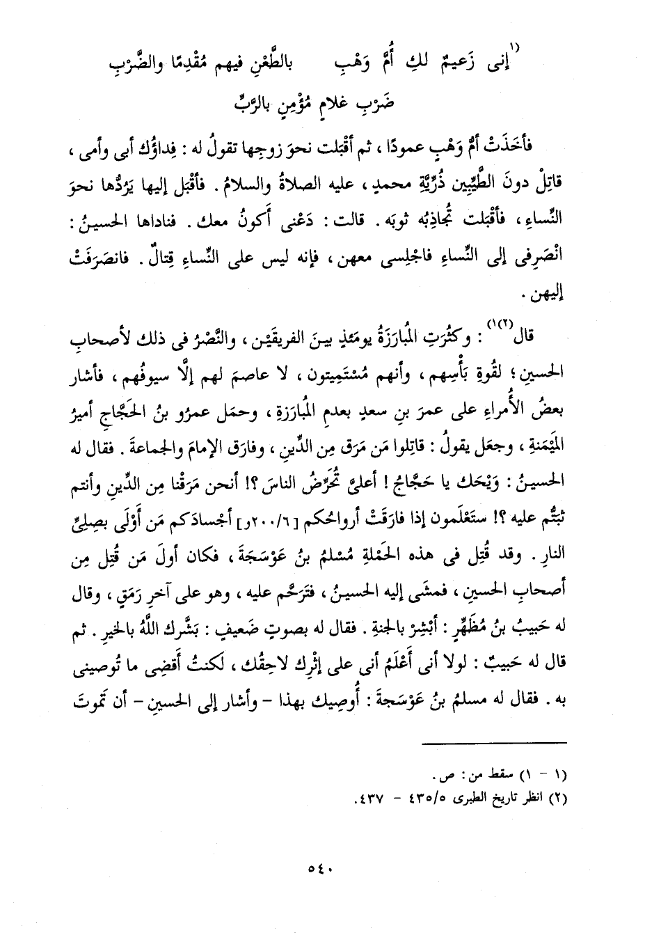 فَأَخَذَتْ أُمُّ وَهْبٍ عَمُودًا، ثُمَّ أَقْبَلَتْ نَحْوَ زَوْجِهَا تَقُولُ لَهُ: فِدَاؤُكَ أَبِي وَأُمِّي، قَاتِلْ دُونَ الطَّيِّبِينَ ذُرِّيَّةِ مُحَمَّدٍ، عَلَيْهِ الصَّلَاةُ وَالسَّلَامُ. فَأَقْبَلَ إِلَيْهَا يَرُدُّهَا نَحْوَ النِّسَاءِ، فَأَقْبَلَتْ تُجَاذِبُهُ ثَوْبَهُ. قَالَتْ: دَعْنِي أَكُونُ مَعَكَ. فَنَادَاهَا الْحُسَيْنُ: انْصَرِفِي إِلَى النِّسَاءِ فَاجْلِسِي مَعَهُنَّ، فَإِنَّهُ لَيْسَ عَلَى النِّسَاءِ قِتَالٌ. فَانْصَرَفَتْ إِلَيْهِنَّ.