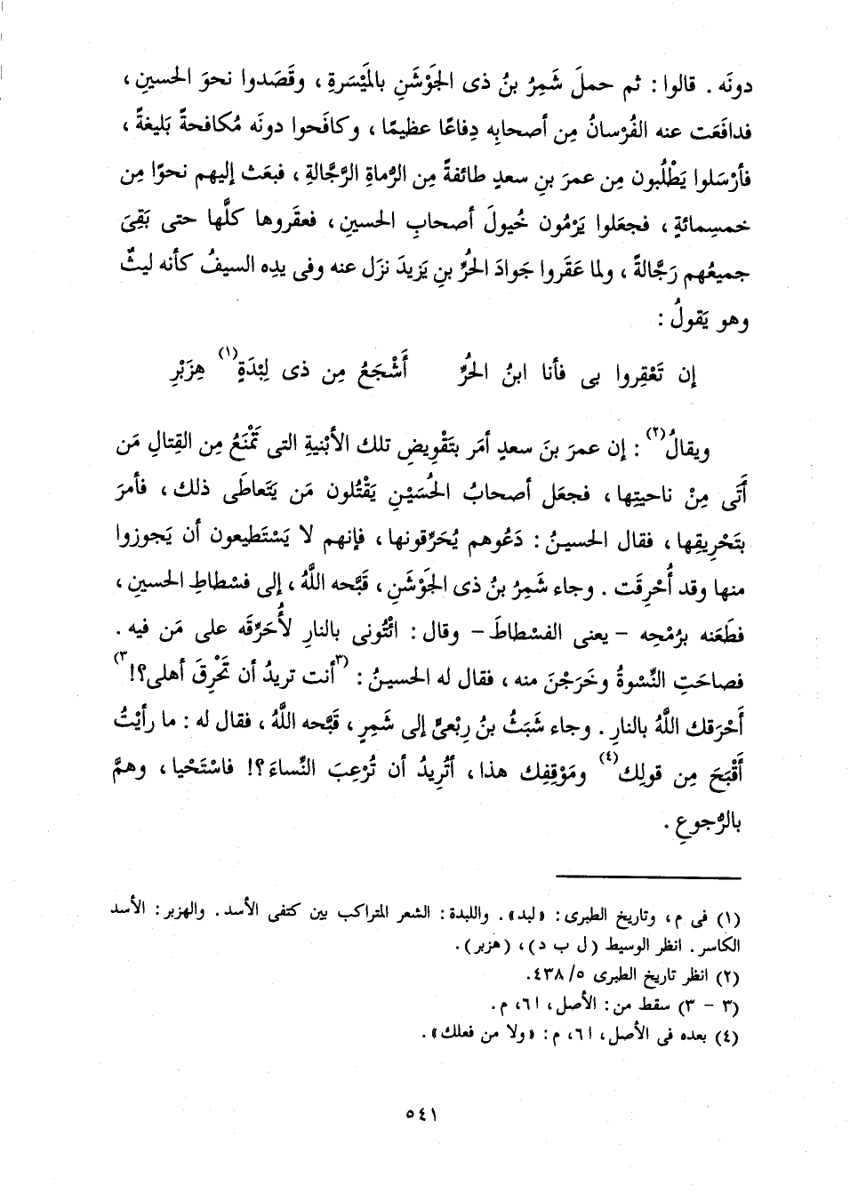 دُونَهُ. قَالُوا: ثُمَّ حَمَلَ شَمِرُ بْنُ ذِي الْجَوْشَنِ بِالْمَيْسَرَةِ، وَقَصَدُوا نَحْوَ الْحُسَيْنِ، فَدَافَعَتْ عَنْهُ الْفُرْسَانُ مِنْ أَصْحَابِهِ دِفَاعًا عَظِيمًا، وَكَافَحُوا دُونَهُ مُكَافَحَةً بَلِيغَةً، فَأَرْسَلُوا يَطْلُبُونَ مِنْ عُمَرَ بْنِ سَعْدٍ طَائِفَةً مِنَ الرُّمَاةِ الرَّجَّالَةِ، فَبَعَثَ إِلَيْهِمْ نَحْوًا مِنْ خَمْسِمِائَةٍ، فَجَعَلُوا يَرْمُونَ خُيُولَ أَصْحَابِ الْحُسَيْنِ، فَعَقَرُوهَا كُلَّهَا حَتَّى بَقِيَ جَمِيعُهُمْ رَجَّالَةً، وَلَمَّا عَقَرُوا جَوَادَ الْحُرِّ بْنِ يَزِيدَ نَزَلَ عَنْهُ وَفِي يَدِهِ السَّيْفُ كَأَنَّهُ لَيْثٌ وَهُوَ يَقُولُ