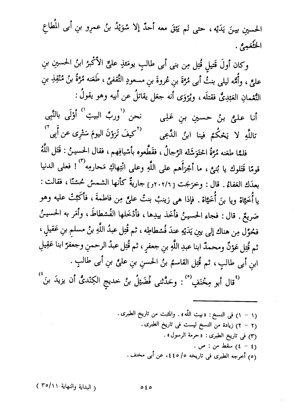 فَلَمَّا طَعَنَهُ مُرَّةُ احْتَوَشَتْهُ الرِّجَالُ، فَقَطَّعُوهُ بِأَسْيَافِهِمْ، فَقَالَ الْحُسَيْنُ: قَتَلَ اللَّهُ قَوْمًا قَتَلُوكَ يَا بُنَيَّ، مَا أَجْرَأَهُمْ عَلَى اللَّهِ وَعَلَى انْتِهَاكِ مَحَارِمِهِ! فَعَلَى الدُّنْيَا بَعْدَكَ الْعَفَاءُ. قَالَ: وَخَرَجَتْ جَارِيَةٌ كَأَنَّهَا الشَّمْسُ حُسْنًا، فَقَالَتْ: يَا أُخَيَّاهُ وَيَا ابْنَ أُخَيَّاهُ. فَإِذَا هِيَ زَيْنَبُ بِنْتُ عَلِيٍّ مِنْ فَاطِمَةَ، فَأَكَبَّتْ عَلَيْهِ وَهُوَ صَرِيعٌ. قَالَ: فَجَاءَ الْحُسَيْنُ فَأَخَذَ بِيَدِهَا، فَأَدْخَلَهَا الْفُسْطَاطَ، وَأَمَرَ بِهِ الْحُسَيْنُ فَحُوِّلَ مِنْ هُنَاكَ إِلَى بَيْنِ يَدَيْهِ عِنْدَ فُسْطَاطِهِ، ثُمَّ قُتِلَ عَبْدُ اللَّهِ بْنِ مُسْلِمِ بْنِ عَقِيلٍ، ثُمَّ قُتِلَ عَوْنٌ وَمُحَمَّدٌ ابْنَا عَبْدِ اللَّهِ بْنِ جَعْفَرٍ، ثُمَّ قُتِلَ عَبْدُ الرَّحْمَنِ وَجَعْفَرٌ ابْنَا عَقِيلِ بْنِ أَبِي طَالِبٍ، ثُمَّ قُتِلَ الْقَاسِمُ بْنُ الْحَسَنِ بْنِ عَلِيِّ بْنِ أَبِي طَالِبٍ.