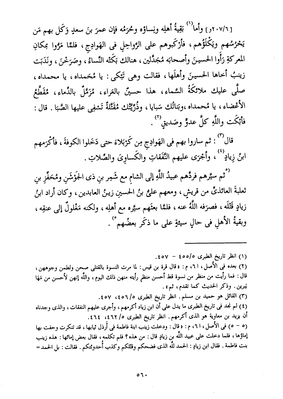 وَأَمَّا بَقِيَّةُ أَهْلِهِ وَنِسَاؤُهُ وَحَرَمُهُ فَإِنَّ عُمَرَ بْنَ سَعْدٍ وَكَلَ بِهِمْ مَنْ يَحْرُسُهُمْ وَيَكْلَؤُهُمْ، فَأَرْكَبُوهُمْ عَلَى الرَّوَاحِلِ فِي الْهَوَادِجِ، فَلَمَّا مَرُّوا بِمَكَانِ الْمَعْرَكَةِ رَأَوُا الْحُسَيْنَ وَأَصْحَابَهُ مُجَدَّلِينَ، هُنَالِكَ بَكَتْهُ النِّسَاءُ، وَصَرَخْنَ وَنَدَبَتْ زَيْنَبُ أَخَاهَا الْحُسَيْنَ وَأَهْلَهَا، فَقَالَتْ وَهِيَ تَبْكِي: يَا مُحَمَّدَاهُ، يَا مُحَمَّدَاهُ، صَلَّى عَلَيْكَ مَلَائِكَةُ السَّمَاءِ، هَذَا حُسَيْنٌ بِالْعَرَاءِ، مُزَمَّلٌ بِالدِّمَاءِ، مُقَطَّعُ الْأَعْضَاءِ، يَا مُحَمَّدَاهُ، وَبَنَاتُكَ سَبَايَا، وَذُرِّيَّتُكَ مُقَتَّلَةٌ تَسْفِي عَلَيْهَا الصَّبَا. قَالَ: فَأَبْكَتْ وَاللَّهِ كُلَّ عَدُوٍّ وَصَدِيقٍ.