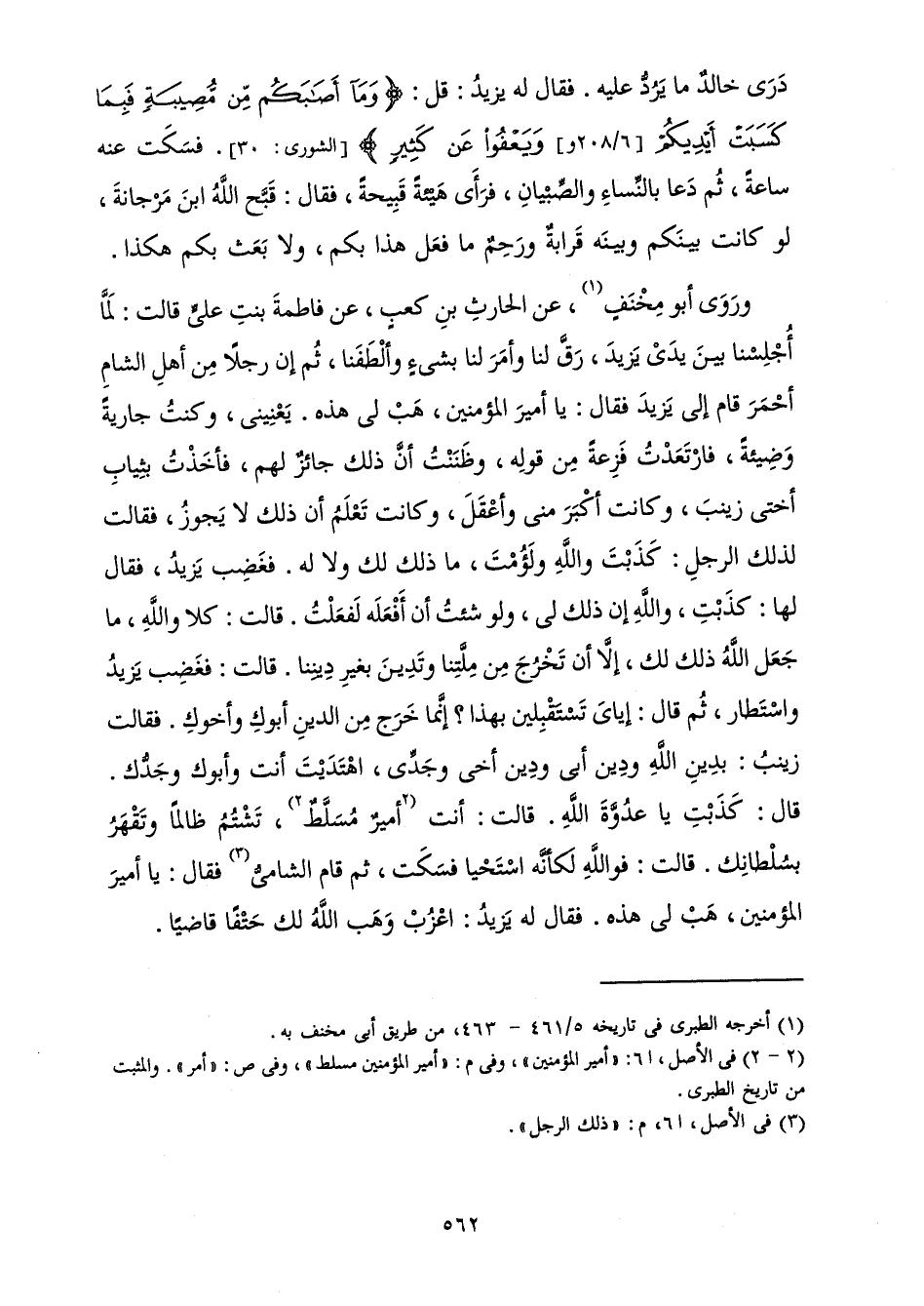 وَرَوَى أَبُو مِخْنَفٍ، عَنِ الْحَارِثِ بْنِ كَعْبٍ، عَنْ فَاطِمَةَ بِنْتِ عَلِيٍّ قَالَتْ: لَمَّا أُجْلِسْنَا بَيْنَ يَدَيْ يَزِيدَ، رَقَّ لَنَا وَأَمَرَ لَنَا بِشَيْءٍ وَأَلْطَفنَا، ثُمَّ إِنَّ رَجُلًا مِنْ أَهْلِ الشَّامِ أَحْمَرَ قَامَ إِلَى يَزِيدَ فَقَالَ: يَا أَمِيرَ الْمُؤْمِنِينَ، هَبْ لِي هَذِهِ. يَعْنِينِي، وَكُنْتُ جَارِيَةً وَضِيئَةً، فَارْتَعَدْتُ فَزِعَةً مِنْ قَوْلِهِ، وَظَنَنْتُ أَنَّ ذَلِكَ جَائِزٌ لَهُمْ، فَأَخَذْتُ بِثِيَابِ أُخْتِي زَيْنَبَ، وَكَانَتْ أَكْبَرَ مِنِّي وَأَعْقَلَ، وَكَانَتْ تَعْلَمُ أَنَّ ذَلِكَ لَا يَجُوزُ، فَقَالَتْ لِذَلِكَ الرَّجُلِ: كَذَبْتَ وَاللَّهِ وَلَؤُمْتَ، مَا ذَلِكَ لَكَ وَلَا لَهُ. فَغَضِبَ يَزِيدُ، فَقَالَ لَهَا: كَذَبْتِ، وَاللَّهِ إِنَّ ذَلِكَ لِي، وَلَوْ شِئْتُ أَنْ أَفْعَلَهُ لَفَعَلْتُ. قَالَتْ: كَلَّا وَاللَّهِ، مَا جَعَلَ اللَّهُ ذَلِكَ لَكَ، إِلَّا أَنْ تَخْرُجَ مِنْ مِلَّتِنَا وَتَدِينَ بِغَيْرِ دِينِنَا. قَالَتْ: فَغَضِبَ يَزِيدُ وَاسْتَطَارَ، ثُمَّ قَالَ: إِيَّايَ تَسْتَقْبِلِينَ بِهَذَا؟ إِنَّمَا خَرَجَ مِنَ الدِّينِ أَبُوكِ وَأَخُوكِ. فَقَالَتْ زَيْنَبُ: بِدِينِ اللَّهِ وَدِينِ أَبِي وَدِينِ أَخِي وَجَدِّي، اهْتَدَيْتَ أَنْتَ وَأَبُوكَ وَجَدُّكَ. قَالَ: كَذَبْتِ يَا عَدُوَّةَ اللَّهِ. قَالَتْ: أَنْتَ أَمِيرٌ مُسَلَّطٌ، تَشْتُمُ ظَالِمًا وَتَقْهَرُ بِسُلْطَانِكَ. قَالَتْ: فَوَاللَّهِ لَكَأَنَّهُ اسْتَحْيَا فَسَكَتَ، ثُمَّ قَامَ الشَّامِيُّ فَقَالَ: يَا أَمِيرَ الْمُؤْمِنِينَ، هَبْ لِي هَذِهِ. فَقَالَ لَهُ يَزِيدُ: اعْزُبْ وَهَبَ اللَّهُ لَكَ حَتْفًا قَاضِيًا.