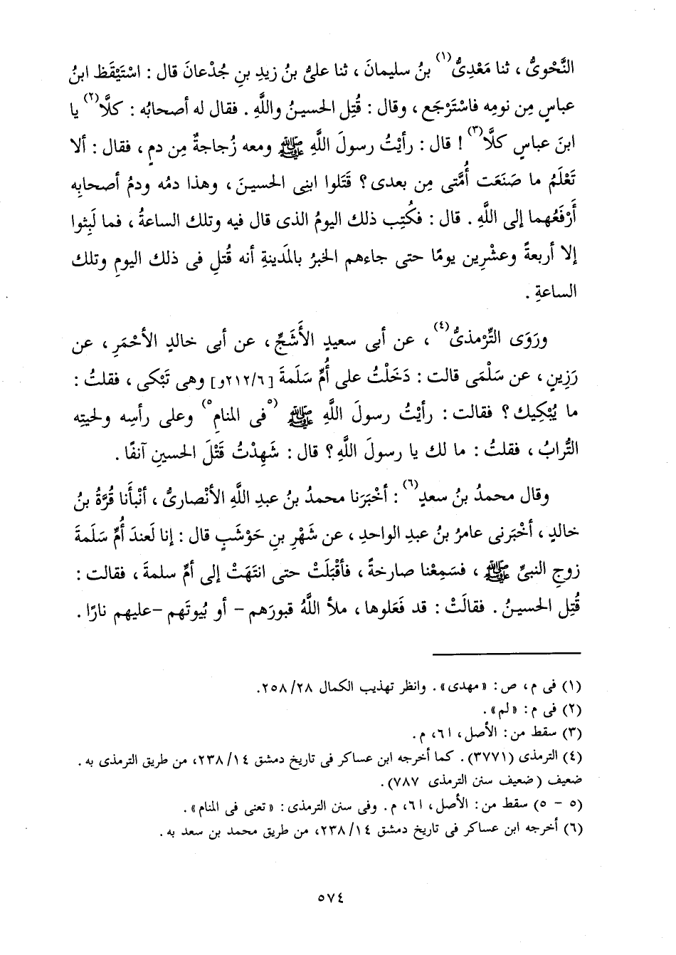 وَرَوَى التِّرْمِذِيُّ، عَنْ أَبِي سَعِيدٍ الْأَشَجِّ، عَنْ أَبِي خَالِدٍ الْأَحْمَرِ، عَنْ رَزِينٍ، عَنْ سَلْمَى قَالَتْ: دَخَلْتُ عَلَى أُمِّ سَلَمَةَ وَهِيَ تَبْكِي، فَقُلْتُ: مَا يُبْكِيكِ؟ فَقَالَتْ: رَأَيْتُ رَسُولَ اللَّهِ صَلَّى اللَّهُ عَلَيْهِ وَسَلَّمَ فِي الْمَنَامِ وَعَلَى رَأْسِهِ وَلِحْيَتِهِ التُّرَابُ، فَقُلْتُ: مَا لَكَ يَا رَسُولَ اللَّهِ؟ قَالَ: شَهِدْتُ قَتْلَ الْحُسَيْنِ آنِفًا.