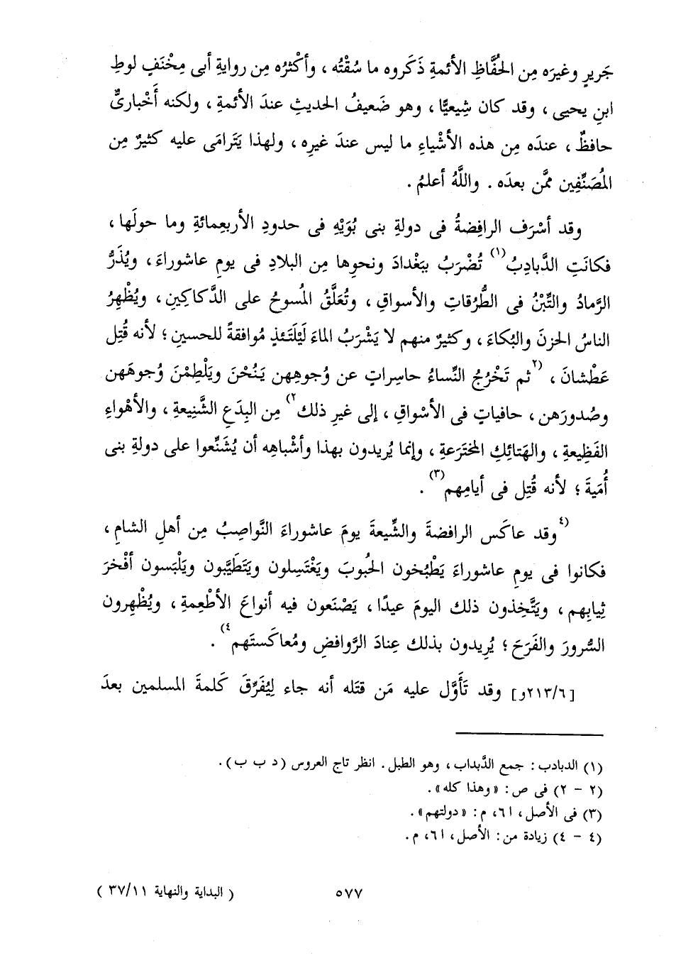 وَقَدْ أَسْرَفَ الرَّافِضَةُ فِي دَوْلَةِ بَنِي بُوَيْهٍ فِي حُدُودِ الْأَرْبَعِمِائَةٍ وَمَا حَوْلَهَا، فَكَانَتِ الدَّبَادِبُ تُضْرَبُ بِبَغْدَادَ وَنَحْوِهَا مِنَ الْبِلَادِ فِي يَوْمِ عَاشُورَاءَ، وَيُذَرُّ الرَّمَادُ وَالتِّبْنُ فِي الطُّرُقَاتِ وَالْأَسْوَاقِ، وَتُعَلَّقُ الْمُسُوحُ عَلَى الدَّكَاكِينِ، وَيُظْهِرُ النَّاسُ الْحُزْنَ وَالْبُكَاءَ، وَكَثِيرٌ مِنْهُمْ لَا يَشْرَبُ الْمَاءَ لَيْلَتَئِذٍ مُوَافَقَةً لَلْحُسَيْنِ، لَأَنَّهُ قُتِلَ عَطْشَانَ، ثُمَّ تَخْرُجُ النِّسَاءُ حَاسِرَاتٍ عَنْ وُجُوهِهِنَّ يَنُحْنَ وَيَلْطِمْنَ وُجُوهَهُنَّ وَصُدُورَهُنَّ، حَافِيَاتٍ فِي الْأَسْوَاقِ، إِلَى غَيْرِ ذَلِكَ مِنَ الْبِدَعِ الشَّنِيعَةِ، وَالْأَهْوَاءِ الْفَظِيعَةِ، وَالْهَتَائِكِ الْمُخْتَرَعَةِ، وَإِنَّمَا يُرِيدُونَ بِهَذَا وَأَشْبَاهِهِ أَنْ يُشَنِّعُوا عَلَى دَوْلَةِ بَنِي أُمَيَّةَ ; لَأَنَّهُ قُتِلَ فِي أَيَّامِهِمْ.