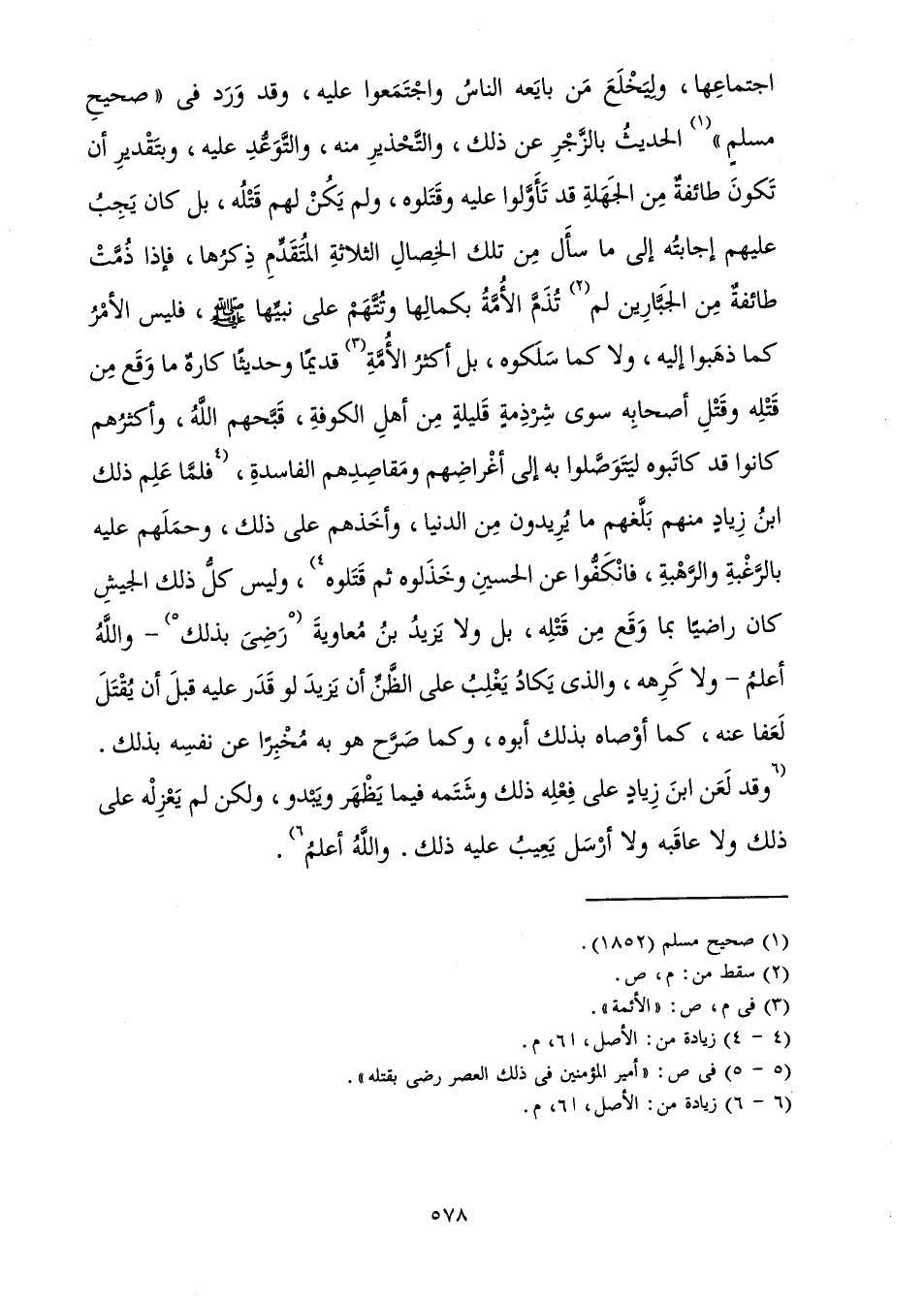 اجْتِمَاعِهَا، وَلِيَخْلَعَ مَنْ بَايَعَهُ النَّاسُ وَاجْتَمَعُوا عَلَيْهِ، وَقَدْ وَرَدَ فِي " صَحِيحِ مُسْلِمٍ " الْحَدِيثُ بِالزَّجْرِ عَنْ ذَلِكَ، وَالتَّحْذِيرِ مِنْهُ، وَالتَّوَعُّدِ عَلَيْهِ، وَبِتَقَدْيرِ أَنْ تَكُونَ طَائِفَةٌ مِنَ الْجَهَلَةِ قَدْ تَأَوَّلُوا عَلَيْهِ وَقَتَلُوهُ، وَلَمْ يَكُنْ لَهُمْ قَتْلُهُ، بَلْ كَانَ يَجِبُ عَلَيْهِمْ إِجَابَتُهُ إِلَى مَا سَأَلَ مِنْ تِلْكَ الْخِصَالِ الثَّلَاثَةِ الْمُتَقَدِّمِ ذِكْرُهَا، فَإِذَا ذُمَّتْ طَائِفَةٌ مِنَ الْجَبَّارِينَ لَمْ تُذَمَّ الْأُمَّةُ بِكَمَالِهَا وَتُتَّهَمْ عَلَى نَبِيِّهَا صَلَّى اللَّهُ عَلَيْهِ وَسَلَّمَ، فَلَيْسَ الْأَمْرُ كَمَا ذَهَبُوا إِلَيْهِ، وَلَا كَمَا سَلَكُوهُ، بَلْ أَكْثَرُ الْأُمَّةِ قَدْيمًا وَحَدِيثًا كَارِهٌ مَا وَقَعَ مِنْ قَتْلِهِ وَقَتْلِ أَصْحَابِهِ سِوَى شِرْذِمَةٍ قَلِيلَةٍ مِنْ أَهْلِ الْكُوفَةِ، قَبَّحَهُمُ اللَّهُ، وَأَكْثَرُهُمْ كَانُوا قَدْ كَاتَبُوهُ لَيَتَوَصَّلُوا بِهِ إِلَى أَغْرَاضِهِمْ وَمَقَاصِدِهِمُ الْفَاسِدَةِ، فَلَمَّا عَلِمَ ذَلِكَ ابْنُ زِيَادٍ مِنْهُمْ بَلَّغَهُمْ مَا يُرِيدُونَ مِنَ الدُّنْيَا، وَأَخَذَهُمْ عَلَى ذَلِكَ، وَحَمَلَهُمْ عَلَيْهِ بِالرَّغْبَةِ وَالرَّهْبَةِ، فَانْكَفُّوا عَنِ الْحُسَيْنِ وَخَذَلُوهُ ثُمَّ قَتَلُوهُ، وَلَيْسَ كُلُّ ذَلِكَ الْجَيْشِ كَانَ رَاضِيًا بِمَا وَقَعَ مِنْ قَتْلِهِ، بَلْ وَلَا يَزِيدُ بْنُ مُعَاوِيَةَ رَضِيَ بِذَلِكَ - وَاللَّهُ أَعْلَمُ - وَلَا كَرِهَهُ، وَالَّذِي يَكَادُ يَغْلِبُ عَلَى الظَّنِّ أَنَّ يَزِيدَ لَوْ قَدَرَ عَلَيْهِ قَبْلَ أَنْ يُقْتَلَ لَعَفَا عَنْهُ، كَمَا أَوْصَاهُ بِذَلِكَ أَبُوهُ، وَكَمَا صَرَّحَ هُوَ بِهِ مُخْبِرًا عَنْ نَفْسِهِ بِذَلِكَ.