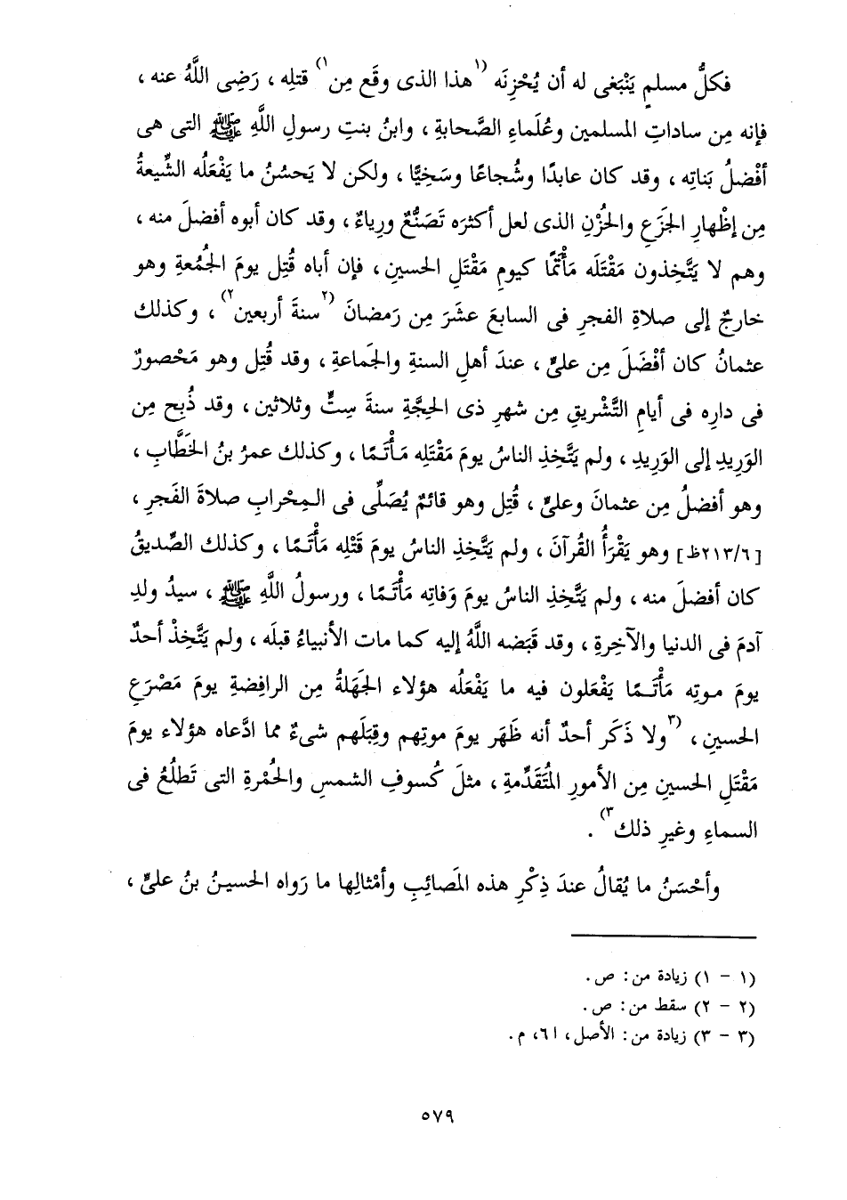 فَكُلُّ مُسْلِمٍ يَنْبَغِي لَهُ أَنْ يُحْزِنَهُ هَذَا الَّذِي وَقَعَ مِنْ قَتْلِهِ، رَضِيَ اللَّهُ عَنْهُ، فَإِنَّهُ مِنْ سَادَاتِ الْمُسْلِمِينَ وَعُلَمَاءِ الصَّحَابَةِ، وَابْنُ بِنْتِ رَسُولِ اللَّهِ صَلَّى اللَّهُ عَلَيْهِ وَسَلَّمَ الَّتِي هِيَ أَفْضَلُ بْناتِهِ، وَقَدْ كَانَ عَابِدًا وَشُجَاعًا وَسَخِيًّا، وَلَكِنْ لَا يُحْسِنُ مَا يَفْعَلُهُ الشِّيعَةُ مِنْ إِظْهَارِ الْجَزَعِ وَالْحُزْنِ الَّذِي لَعَلَّ أَكْثَرَهُ تَصَنُّعٌ وَرِيَاءٌ، وَقَدْ كَانَ أَبُوهُ أَفْضَلَ مِنْهُ، وَهُمْ لَا يَتَّخِذُونَ مَقْتَلَهُ مَأْتَمًا كَيَوْمِ مَقْتَلِ الْحُسَيْنِ، فَإِنَّ أَبَاهُ قُتِلَ يَوْمَ الْجُمُعَةِ وَهُوَ خَارِجٌ إِلَى صَلَاةِ الْفَجْرِ فِي السَّابِعَ عَشَرَ مِنْ رَمَضَانَ سَنَةَ أَرْبَعِينَ، وَكَذَلِكَ عُثْمَانُ كَانَ أَفْضَلَ مِنْ عَلِيٍّ، عِنْدَ أَهْلِ السُّنَّةِ وَالْجَمَاعَةِ، وَقَدْ قُتِلَ وَهُوَ مَحْصُورٌ فِي دَارِهِ فِي أَيَّامِ التَّشْرِيقِ مِنْ شَهْرِ ذِي الْحِجَّةِ سَنَةَ سِتٍّ وَثَلَاثِينَ، وَقَدْ ذُبِحَ مِنَ الْوَرِيدِ إِلَى الْوَرِيدِ، وَلَمْ يَتَّخِذِ النَّاسُ يَوْمَ مَقْتَلِهِ مَأْتَمًا، وَكَذَلِكَ عُمَرُ بْنُ الْخَطَّابِ، وَهُوَ أَفْضَلُ مِنْ عُثْمَانَ وَعَلِيٍّ، قُتِلَ وَهُوَ قَائِمٌ يُصَلِّي فِي الْمِحْرَابِ صَلَاةَ الْفَجْرِ، وَهُوَ يَقْرَأُ الْقُرْآنَ، وَلَمْ يَتَّخِذِ النَّاسَ يَوْمَ قَتْلِهِ مَأْتَمًا، وَكَذَلِكَ الصِّدِّيقُ كَانَ أَفْضَلَ مِنْهُ، وَلَمْ يَتَّخِذِ النَّاسُ يَوْمَ وَفَاتِهِ مَأْتَمًا، وَرَسُولُ اللَّهِ صَلَّى اللَّهُ عَلَيْهِ وَسَلَّمَ، سَيِّدُ وَلَدِ آدَمَ فِي الدُّنْيَا وَالْآخِرَةِ، وَقَدْ قَبَضَهُ اللَّهُ إِلَيْهِ كَمَا مَاتَ الْأَنْبِيَاءُ قَبْلَهُ، وَلَمْ يَتَّخِذْ أَحَدٌ يَوْمَ مَوْتِهِ مَأْتَمًا يَفْعَلُونَ فِيهِ مَا يَفْعَلُهُ هَؤُلَاءِ الْجَهَلَةُ مِنَ الرَّافِضَةِ يَوْمَ مَصْرَعِ الْحُسَيْنِ، وَلَا ذَكَرَ أَحَدٌ أَنَّهُ ظَهَرَ يَوْمَ مَوْتِهِمْ وَقِبَلَهُمْ شَيْءٌ مِمَّا ادَّعَاهُ هَؤُلَاءِ يَوْمَ مَقْتَلِ الْحُسَيْنِ مِنَ الْأُمُورِ الْمُتَقَدِّمَةِ، مِثْلَ كُسُوفِ الشَّمْسِ وَالْحُمْرَةِ الَّتِي تَطْلُعُ فِي السَّمَاءِ وَغَيْرِ ذَلِكَ.