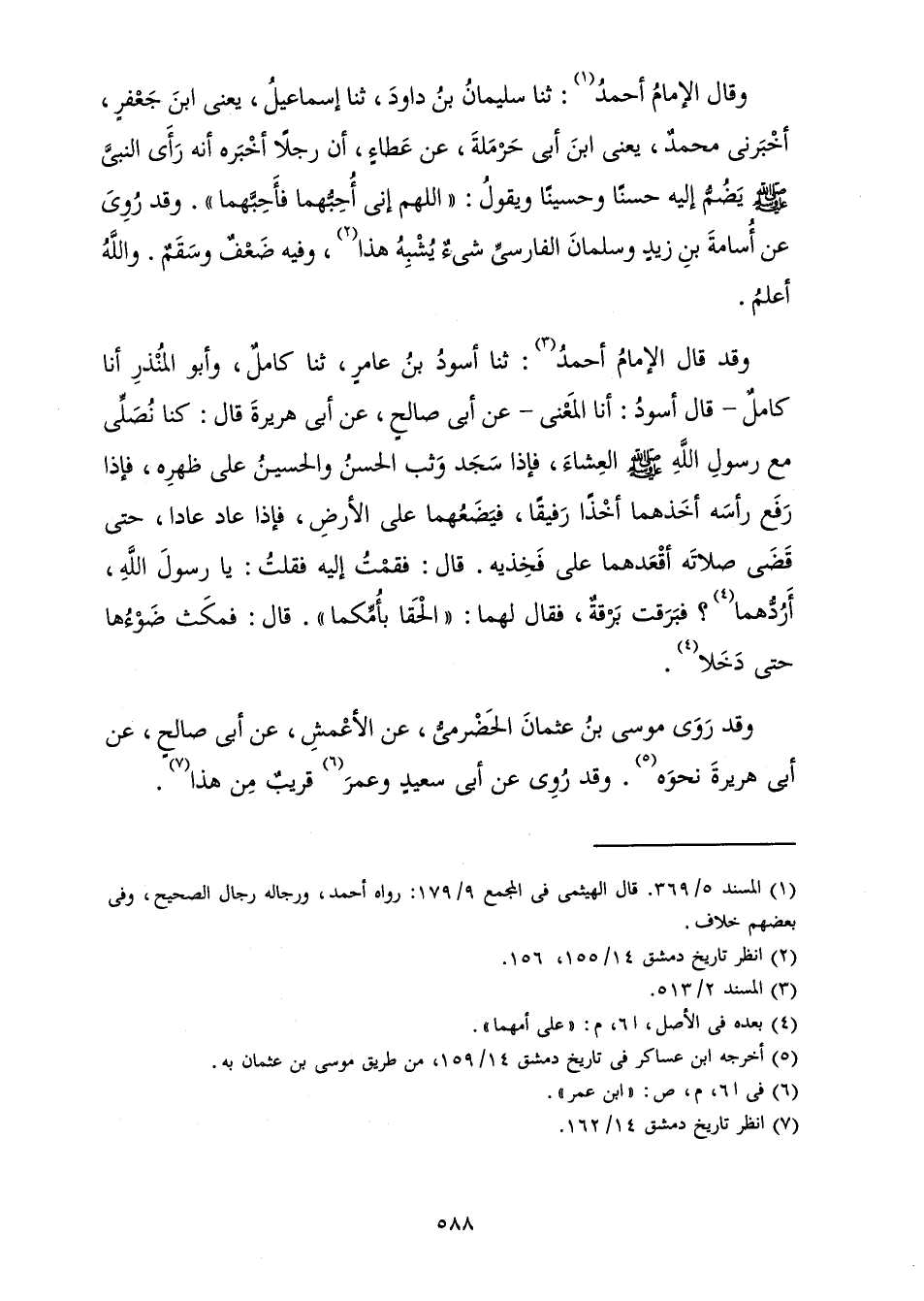 وَقَدْ قَالَ الْإِمَامُ أَحْمَدُ: ثَنَا أَسْوَدُ بْنُ عَامِرٍ، ثَنَا كَامِلٌ، وَأَبُو الْمُنْذِرِ أَنَا كَامِلٌ - قَالَ أَسْوَدُ: أَنَا الْمَعْنَى - عَنْ أَبِي صَالِحٍ، عَنْ أَبِي هُرَيْرَةَ قَالَ «كُنَّا نُصْلِي مَعَ رَسُولِ اللَّهِ صَلَّى اللَّهُ عَلَيْهِ وَسَلَّمَ الْعِشَاءَ، فَإِذَا سَجَدَ وَثَبَ الْحَسَنُ وَالْحُسَيْنُ عَلَى ظَهْرِهِ، فَإِذَا رَفَعَ رَأْسَهُ أَخَذَهُمَا أَخْذًا رَفِيقًا، فَيَضَعُهُمَا عَلَى الْأَرْضِ، فَإِذَا عَادَ عَادَا، حَتَّى قَضَى صَلَاتَهُ أَقْعَدَهُمَا عَلَى فَخِذَيْهِ. قَالَ: فَقُمْتُ إِلَيْهِ فَقُلْتُ: يَا رَسُولَ اللَّهِ، أَرُدُّهُمَا؟ فَبَرَقَتْ بَرْقَةٌ فَقَالَ لَهُمَا: " الْحَقَا بِأُمِّكُمَا ". قَالَ: فَمَكَثَ ضَوْءُهَا حَتَّى دَخَلَا.»