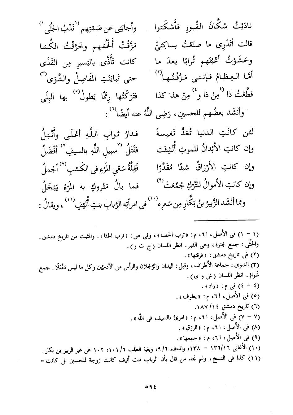 وَمِمَّا أَنْشَدَ الزُّبَيْرُ بْنُ بَكَّارٍ مِنْ شِعْرِهِ فِي امْرَأَتِهِ الرَّبَابِ بِنْتِ أُنَيْفٍ، وَيُقَالُ: