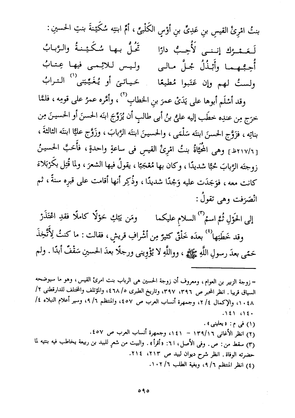 وَقَدْ أَسْلَمَ أَبُوهَا عَلَى يَدَيْ عُمَرَ بْنِ الْخَطَّابِ، وَأَمَّرَهُ عُمَرُ عَلَى قَوْمِهِ، فَلَمَّا خَرَجَ مِنْ عِنْدِهِ خَطَبَ إِلَيْهِ عَلِيُّ بْنُ أَبِي طَالِبٍ أَنْ يُزَوِّجَ ابْنَهُ الْحَسَنَ أَوِ الْحُسَيْنَ مِنْ بَنَاتِهِ، فَزَوَّجَ الْحَسَنَ ابْنَتَهُ سَلْمَى، وَالْحُسَيْنَ ابْنَتَهُ الرَّبَابَ، وَزَوَّجَ عَلِيًّا ابْنَتَهُ الثَّالِثَةَ، وَهِيَ الْمُحَيَّاةُ بِنْتُ امْرِئِ الْقَيْسِ فِي سَاعَةٍ وَاحِدَةٍ، فَأَحَبَّ الْحُسَيْنُ زَوْجَتَهُ الرَّبَابَ حُبًّا شَدِيدًا، وَكَانَ بِهَا مُعْجَبًا، يَقُولُ فِيهَا الشِّعْرَ، وَلَمَّا قُتِلَ بِكَرْبَلَاءَ كَانَتْ مَعَهُ، فَوَجَدَتْ عَلَيْهِ وَجْدًا شَدِيدًا، وَذُكِرَ أَنَّهَا أَقَامَتْ عَلَى قَبْرِهِ سَنَةً، ثُمَّ انْصَرَفَتْ وَهِيَ تَقُولُ:
