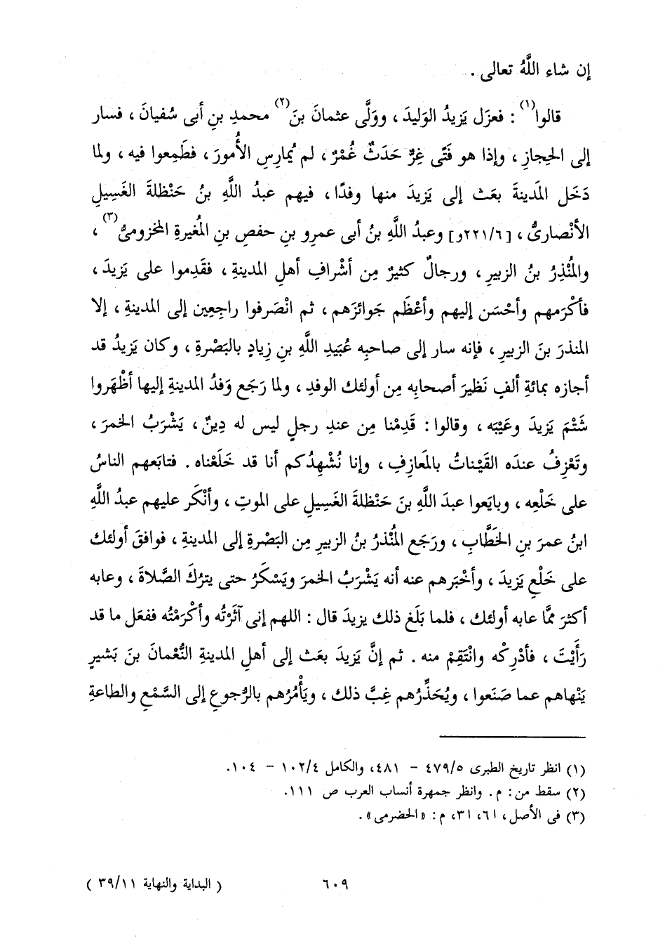 قَالُوا: فَعَزَلَ يَزِيدُ الْوَلِيدَ، وَوَلَّى عُثْمَانَ بْنَ مُحَمَّدِ بْنِ أَبِي سُفْيَانَ، فَسَارَ إِلَى الْحِجَازِ، وَإِذَا هُوَ فَتًى غِرٌّ حَدَثٌ غُمْرٌ، لَمْ يُمَارِسِ الْأُمُورَ، فَطَمِعُوا فِيهِ، وَلَمَّا دَخَلَ الْمَدِينَةَ بَعَثَ إِلَى يَزِيدَ مِنْهَا وَفْدًا، فِيهِمْ عَبْدُ اللَّهِ بْنُ حَنْظَلَةَ الْغَسِيلُ الْأَنْصَارِيُّ، وَعَبْدُ اللَّهِ بْنُ أَبِي عَمْرِو بْنِ حَفْصِ بْنِ الْمُغِيرَةِ الْمَخْزُومِيُّ، وَالْمُنْذِرُ بْنُ الزُّبَيْرِ، وَرِجَالٌ كَثِيرٌ مِنْ أَشْرَافِ أَهْلِ الْمَدِينَةِ فَقَدِمُوا عَلَى يَزِيدَ، فَأَكْرَمَهُمْ وَأَحْسَنَ إِلَيْهِمْ وَأَعْظَمَ جَوَائِزَهُمْ، ثُمَّ انْصَرَفُوا رَاجِعِينَ إِلَى الْمَدِينَةِ، إِلَّا الْمُنْذِرَ بْنَ الزُّبَيْرِ، فَإِنَّهُ سَارَ إِلَى صَاحِبِهِ عُبَيْدِ اللَّهِ بْنِ زِيَادٍ بِالْبَصْرَةِ، وَكَانَ يَزِيدُ قَدْ أَجَازَهُ بِمِائَةِ أَلْفٍ نَظِيرَ أَصْحَابِهِ مِنْ أُولَئِكَ الْوَفْدِ، وَلَمَّا رَجَعَ وَفْدُ الْمَدِينَةِ إِلَيْهَا أَظْهَرُوا شَتْمَ يَزِيدَ وَعَيْبَهُ، وَقَالُوا: قَدِمْنَا مِنْ عِنْدِ رَجُلٍ لَيْسَ لَهُ دِينٌ، يَشْرَبُ الْخَمْرَ، وَتَعْزِفُ عِنْدَهُ الْقَيْنَاتُ بِالْمَعَازِفِ، وَإِنَّا نُشْهِدُكُمْ أَنَّا قَدْ خَلَعْنَاهُ. فَتَابَعَهُمُ النَّاسُ عَلَى خَلْعِهِ، وَبَايَعُوا عَبْدَ اللَّهِ بْنَ حَنْظَلَةَ الْغَسِيلَ عَلَى الْمَوْتِ، وَأَنْكَرَ عَلَيْهِمْ عَبْدُ اللَّهِ بْنُ عُمَرَ بْنِ الْخَطَّابِ، وَرَجَعَ الْمُنْذِرُ بْنُ الزُّبَيْرِ مِنَ الْبَصْرَةِ إِلَى الْمَدِينَةِ، فَوَافَقَ أُولَئِكَ عَلَى خَلْعِ يَزِيدَ، وَأَخْبَرَهُمْ عَنْهُ أَنَّهُ يَشْرَبُ الْخَمْرَ وَيَسْكَرُ حَتَّى يَتْرُكَ الصَّلَاةَ، وَعَابَهُ أَكْثَرُ مِمَّا عَابَهُ أُولَئِكَ، فَلَمَّا بَلَغَ ذَلِكَ يَزِيدَ قَالَ: اللَّهُمَّ إِنِّي آثَرْتُهُ وَأَكْرَمْتُهُ فَفَعَلَ مَا قَدْ رَأَيْتَ، فَأَدْرِكْهُ وَانْتَقِمَ مِنْهُ. ثُمَّ إِنَّ يَزِيدَ بَعَثَ إِلَى أَهْلِ الْمَدِينَةِ النُّعْمَانَ بْنَ بَشِيرٍ يَنْهَاهُمْ عَمَّا صَنَعُوا، وَيُحَذِّرُهُمْ غِبَّ ذَلِكَ، وَيَأْمُرُهُمْ بِالرُّجُوعِ إِلَى السَّمْعِ وَالطَّاعَةِ