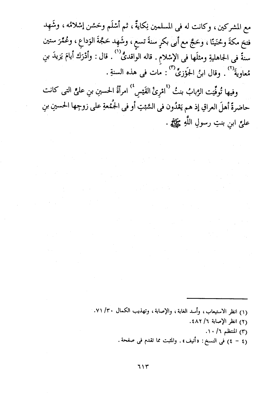 وَفِيهَا تُوُفِّيَتِ الرَّبَابُ بِنْتُ امْرِئِ الْقَيْسِ امْرَأَةُ الْحُسَيْنِ بْنِ عَلِيٍّ الَّتِي كَانَتْ حَاضِرَةً أَهْلَ الْعِرَاقِ إِذْ هُمْ يَعْدُونَ فِي السَّبْتِ أَوْ فِي الْجُمُعَةِ عَلَى زَوْجِهَا الْحُسَيْنِ بْنِ عَلِيِّ ابْنِ بِنْتِ رَسُولِ اللَّهِ صَلَّى اللَّهُ عَلَيْهِ وَسَلَّمَ.