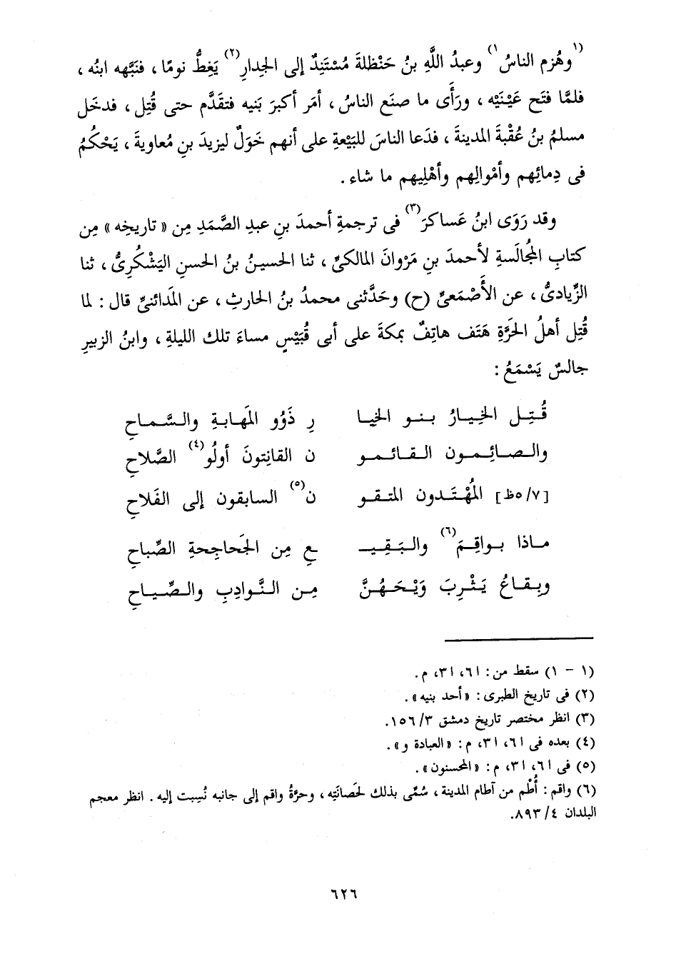 وَقَدْ رَوَى ابْنُ عَسَاكِرَ فِي تَرْجَمَةِ أَحْمَدَ بْنِ عَبْدِ الصَّمَدِ مِنْ " تَارِيخِهِ " مِنْ كِتَابِ الْمُجَالَسَةِ لِأَحْمَدَ بْنِ مَرْوَانَ الْمَالِكِيِّ، ثَنَا الْحُسَيْنُ بْنُ الْحَسَنِ الْيَشْكُرِيُّ، ثَنَا الزِّيَادِيُّ، عَنِ الْأَصْمَعِيِّ (ح) وَحَدَّثَنِي مُحَمَّدُ بْنُ الْحَارِثِ، عَنِ الْمَدَائِنِيِّ قَالَ: لَمَّا قُتِلَ أَهْلُ الْحَرَّةِ هَتَفَ هَاتِفٌ بِمَكَّةَ عَلَى أَبِي قُبَيْسٍ مَسَاءَ تِلْكَ اللَّيْلَةِ، وَابْنُ الزُّبَيْرِ جَالِسٌ يَسْمَعُ: