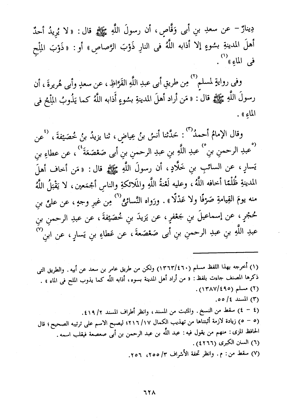 وَفِي رِوَايَةٍ لِمُسْلِمٍ مِنْ طَرِيقِ أَبِي عَبْدِ اللَّهِ الْقَرَّاظِ، عَنْ سَعْدٍ وَأَبِي هُرَيْرَةَ، أَنَّ رَسُولَ اللَّهِ صَلَّى اللَّهُ عَلَيْهِ وَسَلَّمَ قَالَ: «مَنْ أَرَادَ أَهْلَ الْمَدِينَةِ بِسُوءٍ أَذَابَهُ اللَّهُ كَمَا يَذُوبُ الْمِلْحُ فِي الْمَاءِ ".»
