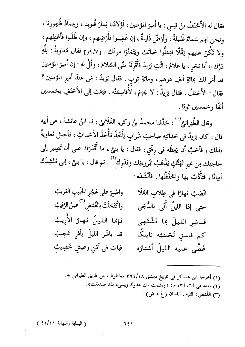 فَقَالَ لَهُ الْأَحْنَفُ بْنُ قَيْسٍ: يَا أَمِيرَ الْمُؤْمِنِينَ، أَوْلَادُنَا ثِمَارُ قُلُوبِنَا، وَعِمَادُ ظُهُورِنَا، وَنَحْنُ لَهُمْ سَمَاءٌ ظَلِيلَةٌ وَأَرْضٌ ذَلِيلَةٌ، إِنْ غَضِبُوا فَأَرْضِهِمْ، وَإِنْ طَلَبُوا فَأَعْطِهِمْ، وَلَا تَكُنْ عَلَيْهِمْ ثِقْلًا فَيَمَلُّوا حَيَاتَكَ وَيَتَمَنَّوْا مَوْتَكَ. فَقَالَ مُعَاوِيَةُ: لِلَّهِ دَرُّكَ يَا أَبَا بَحْرٍ، يَا غُلَامُ، ائْتِ يَزِيدَ فَأَقْرِئْهُ مِنِّي السَّلَامَ، وَقُلْ لَهُ: إِنَّ أَمِيرَ الْمُؤْمِنِينَ قَدْ أَمَرَ لَكَ بِمِائَةِ أَلْفِ دِرْهَمٍ، وَمِائَةِ ثَوْبٍ. فَقَالَ يَزِيدُ: مِنْ عِنْدِ أَمِيرِ الْمُؤْمِنِينَ؟ فَقَالَ: الْأَحْنَفُ. فَقَالَ يَزِيدُ: لَا جَرَمَ، لَأُقَاسِمَنَّهُ. فَبَعَثَ إِلَى الْأَحْنَفِ بِخَمْسِينَ أَلْفًا وَخَمْسِينَ ثَوْبًا.