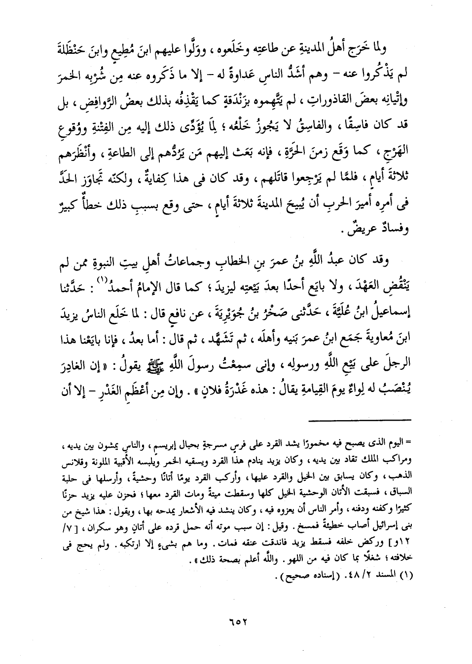 وَلَمَّا خَرَجَ أَهْلُ الْمَدِينَةِ عَنْ طَاعَتِهِ وَخَلَعُوهُ، وَوَلَّوْا عَلَيْهِمُ ابْنَ مُطِيعٍ وَابْنَ حَنْظَلَةَ لَمْ يَذْكُرُوا عَنْهُ - وَهُمْ أَشَدُّ النَّاسِ عَدَاوَةً لَهُ - إِلَّا مَا ذَكَرُوهُ عَنْهُ مِنْ شُرْبِهِ الْخَمْرَ وَإِتْيَانِهِ بَعْضَ الْقَاذُورَاتِ، لَمْ يَتَّهِمُوهُ بِزَنْدَقَةٍ كَمَا يَقْذِفُهُ بِذَلِكَ بَعْضُ الرَّوَافِضِ، بَلْ قَدْ كَانَ فَاسِقًا، وَالْفَاسِقُ لَا يَجُوزُ خَلْعُهُ ; لِمَا يُؤَدِّي ذَلِكَ إِلَيْهِ مِنَ الْفِتْنَةِ وَوُقُوعِ الْهَرْجِ، كَمَا وَقَعَ زَمَنَ الْحَرَّةِ، فَإِنَّهُ بَعَثَ إِلَيْهِمْ مَنْ يَرُدُّهُمْ إِلَى الطَّاعَةِ، وَأَنْظَرَهُمْ ثَلَاثَةَ أَيَّامٍ، فَلَمَّا لَمْ يَرْجِعُوا قَاتَلَهُمْ، وَقَدْ كَانَ فِي هَذَا كِفَايَةٌ، وَلَكِنَّهُ تَجَاوَزَ الْحَدَّ فِي أَمْرِهِ أَمِيرَ الْحَرْبِ أَنْ يُبِيحَ الْمَدِينَةَ ثَلَاثَةَ أَيَّامٍ، حَتَّى وَقَعَ بِسَبَبِ ذَلِكَ خَطَأٌ كَبِيرٌ وَفَسَادٌ عَرِيضٌ.