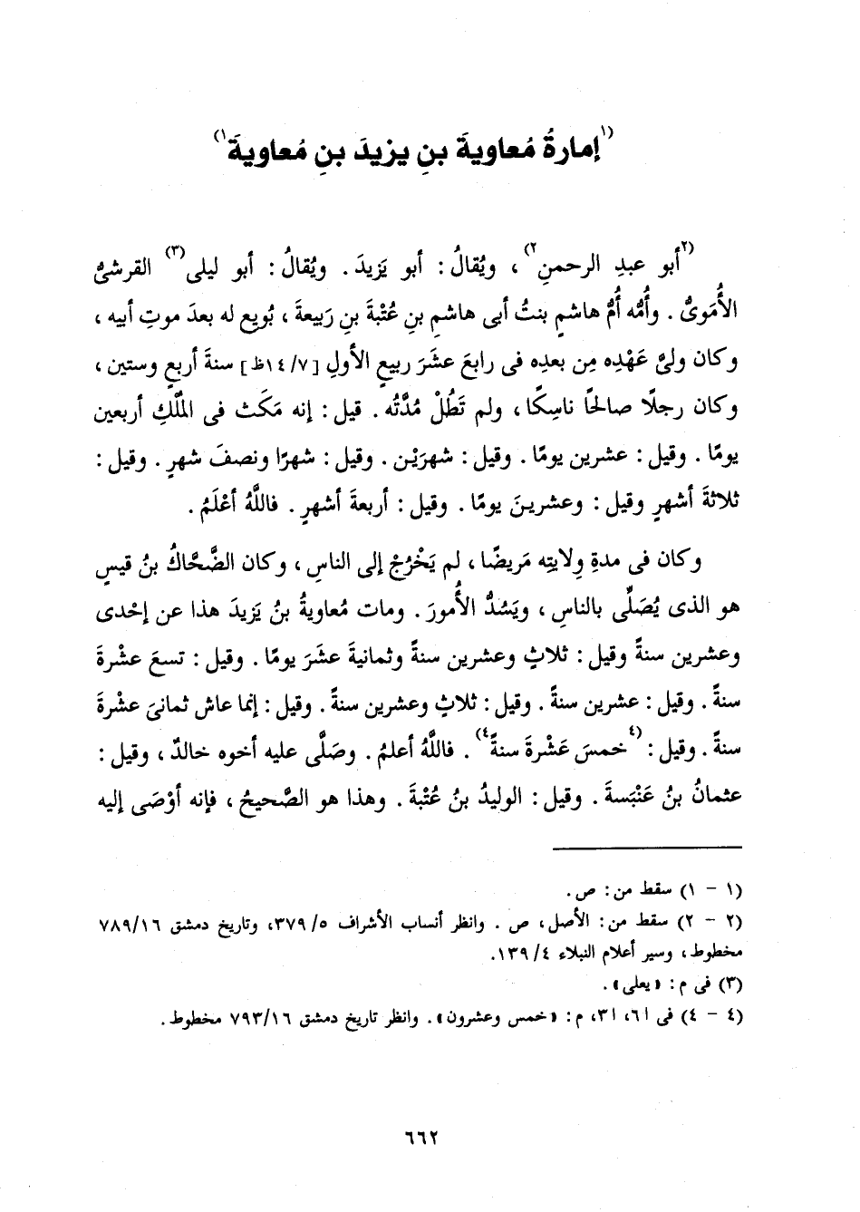 أَبُو عَبْدِ الرَّحْمَنِ، وَيُقَالُ: أَبُو يَزِيدَ. وَيُقَالُ: أَبُو لَيْلَى الْقُرَشِيُّ الْأُمَوِيُّ. وَأُمُّهُ أُمُّ هَاشِمٍ بِنْتُ أَبِي هَاشِمِ بْنِ عُتْبَةَ بْنِ رَبِيعَةَ، بُويِعَ لَهُ بَعْدَ مَوْتِ أَبِيهِ، وَكَانَ وَلِيَّ عَهْدِهِ مِنْ بَعْدِهِ فِي رَابِعَ عَشَرَ رَبِيعٍ الْأَوَّلِ سَنَةَ أَرْبَعٍ وَسِتِّينَ، وَكَانَ رَجُلًا صَالِحًا نَاسِكًا، وَلَمْ تَطُلْ مُدَّتُهُ. قِيلَ: إِنَّهُ مَكَثَ فِي الْمُلْكِ أَرْبَعِينَ يَوْمًا. وَقِيلَ: عِشْرِينَ يَوْمًا. وَقِيلَ: شَهْرَيْنِ. وَقِيلَ: شَهْرًا وَنِصْفَ شَهْرٍ. وَقِيلَ: ثَلَاثَةَ أَشْهُرٍ وَقِيلَ: وَعِشْرِينَ يَوْمًا. وَقِيلَ أَرْبَعَةَ أَشْهُرٍ. فَاللَّهُ أَعْلَمُ.