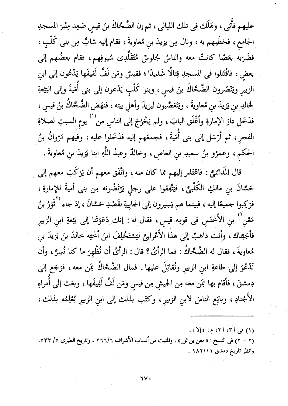عَلَيْهِمْ فَأَبَى، وَهَلَكَ فِي تِلْكَ اللَّيَالِي، ثُمَّ إِنَّ الضَّحَّاكَ بْنَ قَيْسٍ صَعِدَ مِنْبَرَ الْمَسْجِدِ الْجَامِعِ، فَخَطَبَهُمْ بِهِ، وَنَالَ مِنْ يَزِيدَ بْنِ مُعَاوِيَةَ، فَقَامَ إِلَيْهِ شَابٌّ مِنْ بَنِي كَلْبٍ، فَضَرَبَهُ بِعَصًا كَانَتْ مَعَهُ وَالنَّاسُ جُلُوسٌ مُتَقَلِّدِي سُيُوفَهُمْ، فَقَامَ بَعْضُهُمْ إِلَى بَعْضٍ، فَاقْتَتَلُوا فِي الْمَسْجِدِ قِتَالًا شَدِيدًا ; فَقَيْسٌ وَمَنْ لَفَّ لَفِيفَهَا يَدْعُونَ إِلَى ابْنِ الزُّبَيْرِ وَيَنْصُرُونَ الضَّحَّاكَ بْنَ قَيْسٍ، وَبَنُو كَلْبٍ يَدْعُونَ إِلَى بَنِي أُمَيَّةَ وَإِلَى الْبَيْعَةِ لِخَالِدِ بْنِ يَزِيدَ بْنِ مُعَاوِيَةَ، وَيَتَعَصَّبُونَ لِيَزِيدَ وَأَهْلِ بَيْتِهِ، فَنَهَضَ الضَّحَّاكُ بْنُ قَيْسٍ، فَدَخَلَ دَارَ الْإِمَارَةِ وَأَغْلَقَ الْبَابَ، وَلَمْ يَخْرُجْ إِلَى النَّاسِ مِنْ يَوْمِ السَّبْتِ لِصَلَاةِ الْفَجْرِ، ثُمَّ أَرْسَلَ إِلَى بَنِي أُمَيَّةَ، فَجَمَعَهُمْ إِلَيْهِ فَدَخَلُوا عَلَيْهِ، وَفِيهِمْ مَرْوَانُ بْنُ الْحَكَمِ، وَعَمْرُو بْنُ سَعِيدِ بْنِ الْعَاصِ، وَخَالِدٌ وَعَبْدُ اللَّهِ ابْنَا يَزِيدَ بْنِ مُعَاوِيَةَ.