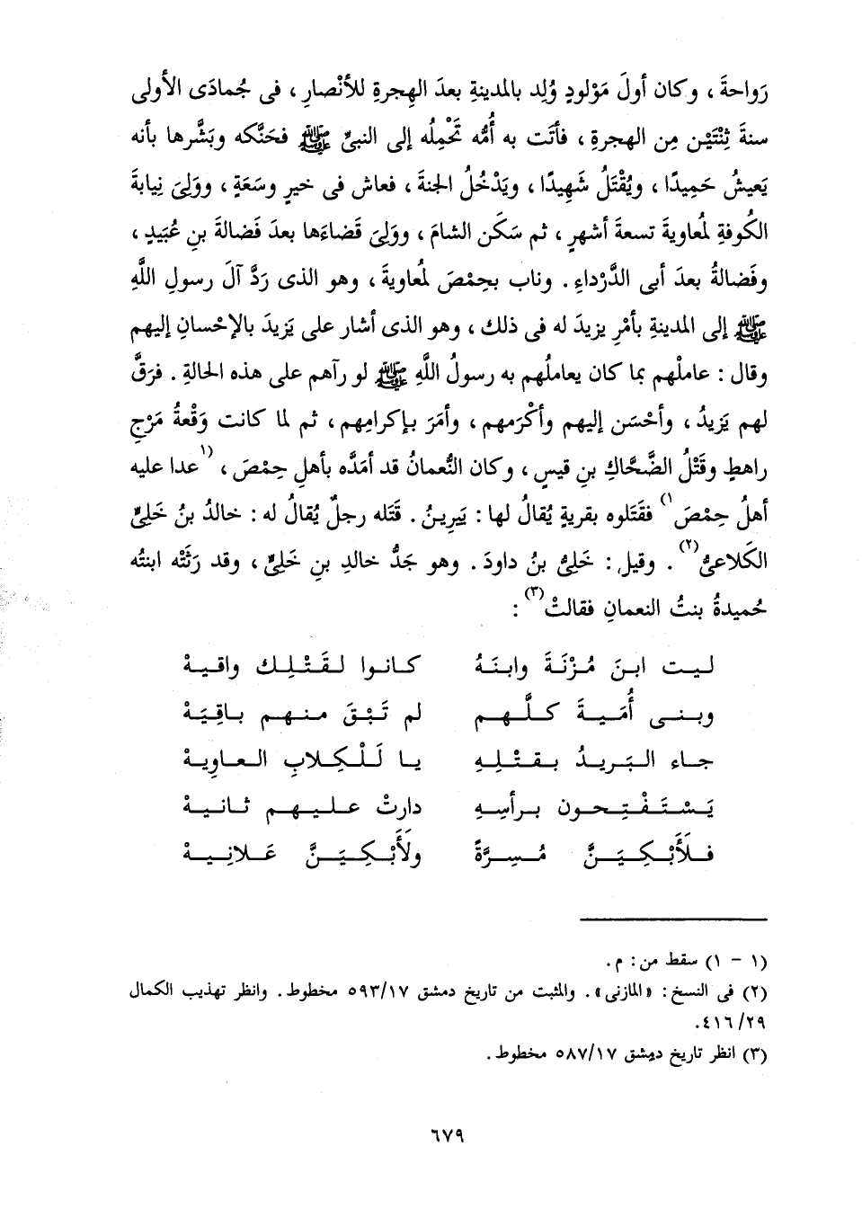 رَوَاحَةَ، وَكَانَ أَوَّلَ مَوْلُودٍ وُلِدَ بِالْمَدِينَةِ بَعْدَ الْهِجْرَةِ لِلْأَنْصَارِ، فِي جُمَادَى الْأُولَى سَنَةَ ثِنْتَيْنِ مِنَ الْهِجْرَةِ، «فَأَتَتْ بِهِ أُمُّهُ تَحْمِلُهُ إِلَى النَّبِيِّ صَلَّى اللَّهُ عَلَيْهِ وَسَلَّمَ فَحَنَّكَهُ وَبَشَّرَهَا بِأَنَّهُ يَعِيشُ حَمِيدًا، وَيُقْتَلُ شَهِيدًا، وَيَدْخُلُ الْجَنَّةَ» ، فَعَاشَ فِي خَيْرٍ وَسَعَةٍ، وَوَلِيَ نِيَابَةَ الْكُوفَةِ لِمُعَاوِيَةَ تِسْعَةَ أَشْهُرٍ، ثُمَّ سَكَنَ الشَّامَ، وَوَلِيَ قَضَاءَهَا بَعْدَ فَضَالَةَ بْنِ عُبَيْدٍ، وَفَضَالَةُ بَعْدَ أَبِي الدَّرْدَاءِ. وَنَابَ بِحِمْصَ لِمُعَاوِيَةَ، وَهُوَ الَّذِي رَدَّ آلَ رَسُولِ اللَّهِ صَلَّى اللَّهُ عَلَيْهِ وَسَلَّمَ إِلَى الْمَدِينَةِ بِأَمْرِ يَزِيدَ لَهُ فِي ذَلِكَ، وَهُوَ الَّذِي أَشَارَ عَلَى يَزِيدَ بِالْإِحْسَانِ إِلَيْهِمْ وَقَالَ: عَامِلْهُمْ بِمَا كَانَ يُعَامِلُهُمْ بِهِ رَسُولُ اللَّهِ صَلَّى اللَّهُ عَلَيْهِ وَسَلَّمَ لَوْ رَآهُمْ عَلَى هَذِهِ الْحَالَةِ. فَرَقَّ لَهُمْ يَزِيدُ، وَأَحْسَنَ إِلَيْهِمْ وَأَكْرَمَهُمْ، وَأَمَرَ بِإِكْرَامِهِمْ، ثُمَّ لَمَّا كَانَتْ وَقْعَةُ مَرْجِ رَاهِطٍ وَقُتْلُ الضَّحَّاكِ بْنِ قَيْسٍ، وَكَانَ النُّعْمَانُ قَدْ أَمَدَّهُ بِأَهْلِ حِمْصَ عَدَا عَلَيْهِ أَهِلُ حِمْصَ فَقَتَلُوهُ بِقَرْيَةٍ يُقَالُ لَهَا: يَيْرِينُ. قَتَلَهُ رَجُلٌ يُقَالُ لَهُ: خَالِدُ بْنُ خَلِيٍّ الْكَلَاعِيُّ. وَقِيلَ: خَلِيُّ بْنُ دَاوُدَ. وَهُوَ جَدُّ خَالِدِ بْنِ خَلِيٍّ، وَقَدْ رَثَتْهُ ابْنَتُهُ حُمَيْدَةُ بِنْتُ النُّعْمَانِ فَقَالَتْ:
