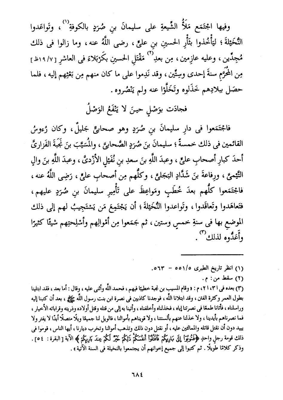 وَفِيهَا اجْتَمَعَ مَلَأُ الشِّيعَةِ عَلَى سُلَيْمَانَ بْنِ صُرَدٍ بِالْكُوفَةِ، وَتَوَاعَدُوا النَّخِيلَةَ ; لِيَأْخُذُوا بِثَأْرِ الْحُسَيْنِ بْنِ عَلِيٍّ، رَضِيَ اللَّهُ عَنْهُ، وَمَا زَالُوا فِي ذَلِكَ مُجِدِّينَ، وَعَلَيْهِ عَازِمِينَ، مِنْ بَعْدِ مَقْتَلِ الْحُسَيْنِ بِكَرْبَلَاءَ فِي الْعَاشِرِ مِنَ الْمُحَرَّمِ سَنَةَ إِحْدَى وَسِتِّينَ، وَقَدْ نَدِمُوا عَلَى مَا كَانَ مِنْهُمْ مِنْ بَعْثِهِمْ إِلَيْهِ، فَلَمَّا حَصَلَ بِبِلَادِهِمْ خَذَلُوهُ وَتَخَلَّوْا عَنْهُ وَلَمْ يَنْصُرُوهُ.