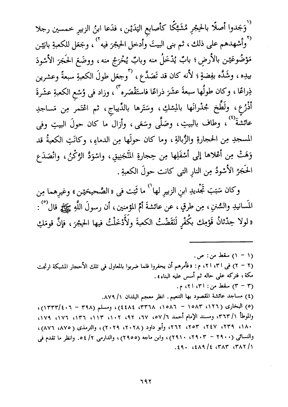 وَكَانَ سَبَبُ تَجْدِيدِ ابْنِ الزُّبَيْرِ لَهَا مَا ثَبَتَ فِي " الصَّحِيحَيْنِ " وَغَيْرِهِمَا مِنَ الْمَسَانِيدِ وَالسُّنَنِ، مِنْ طُرُقٍ، عَنْ عَائِشَةَ أُمِّ الْمُؤْمِنِينَ، أَنَّ رَسُولَ اللَّهِ صَلَّى اللَّهُ عَلَيْهِ وَسَلَّمَ قَالَ: «لَوْلَا حِدْثَانُ قَوْمِكِ بِكُفْرٍ لَنَقَضْتُ الْكَعْبَةَ وَلَأَدْخَلْتُ فِيهَا الْحَجَرَ، فَإِنَّ قَوْمَكِ